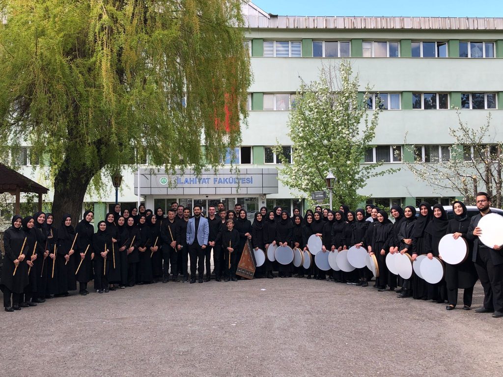 Fakültemiz Türk Din Musikisi Öğretim Elemanı Öğr. Gör. Mustafa ÖZFİDAN öncülüğünde Ney ve Bendir Kursu sonucunda çok kısa bir süre içerisinde büyük bir başarıya imza atılarak oluşturulan Ney ve Bendir Ekibi Fakültemiz önünde hatıra fotoğrafı çekildiler.