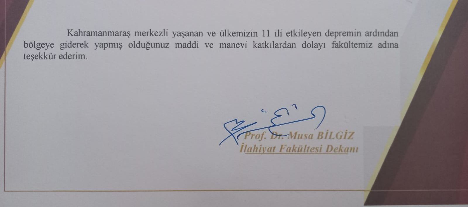 Ülke olarak yaşadığımız deprem ardından depremzede kardeşlerimize destek olmak üzere bölgeye giden, öğretim üyelerimiz; Dr. Öğretim Üyesi Fikrullah Çakmak, Öğr. Görevlisi Muhammet Güray BİZKEVELCİ, Prof. Dr. Muhammed KIZILGEÇİT ve Prof. Dr. Mustafa MACİT hocalarımıza dekanlığımız tarafından teşekkür belgesi verildi.