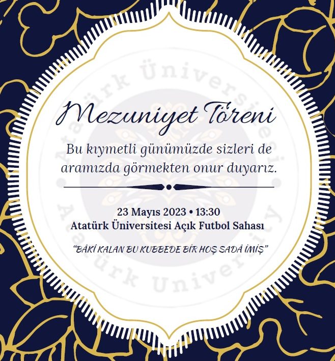2022-2023 eğitim öğretim yılı mezuniyet törenimiz 23 Mayıs 2023 tarihi Salı günü saat 13.00’da Atatürk Üniversitesi Açık Futbol Sahasında gerçekleştirilecektir.