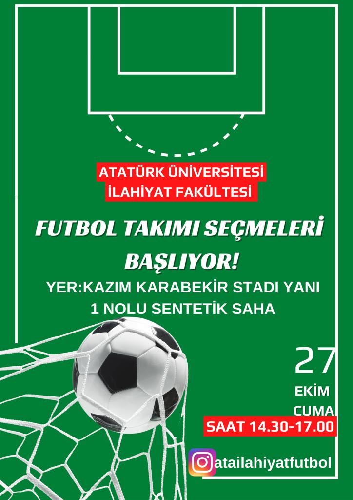2023-2024 Akademik yılında düzenlenecek olan Üniversitemiz Fakülteler Arası Futbol Turnuvasına katılacak, Fakültemiz erkek futbol takımı seçmeleri 27 Ekim 2023 Cuma günü saat 14.30’da Kâzım Karabekir Stadyumu yanında yer alan 1 nolu sentetik sahada gerçekleştirilecektir.