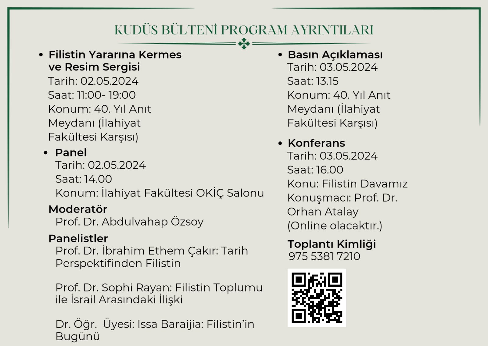 Atatürk Üniversitesi İlahiyat Fakültesi öğrencileri ve kulüplerinin öncülüğünde düzenlenen “Kudüs Bülteni” etkinlikleri, 2-3 Mayıs tarihlerinde gerçekleşti. Filistin ve Gazze’deki kardeşlerimize destek olmak amacıyla düzenlenen etkinlikler, farklı etkinlikler ve panellerle dolu bir programla renklendi.