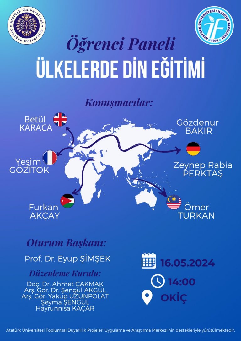 16 Mayıs 2024 Perşembe günü saat 14.00’te OKİÇ Salonu’nda “Ülkelerde Din Eğitimi” konulu öğrenci paneli gerçekleştirildi.Panelde, Betül Karaca, Gözdenur Bakır, Yeşim Gözitok, Furkan Akçay, Zeynep Rabia Perktaş ve Ömer Turkan konuşmacı olarak yer aldı. Oturum Başkanlığını Prof. Dr. Eyup Şimşek’in yaptığı panelde, farklı ülkelerdeki din eğitimi sistemleri ve uygulamaları ele alındı.
