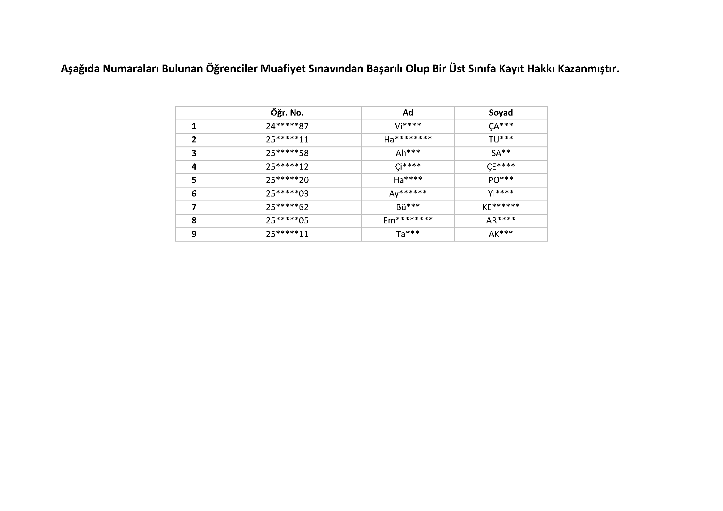 Aşağıdaki iki listede de numarası bulunmayan öğrenciler, sınavdan başarısız olup hazırlık sınıfını tekrar edecektir.