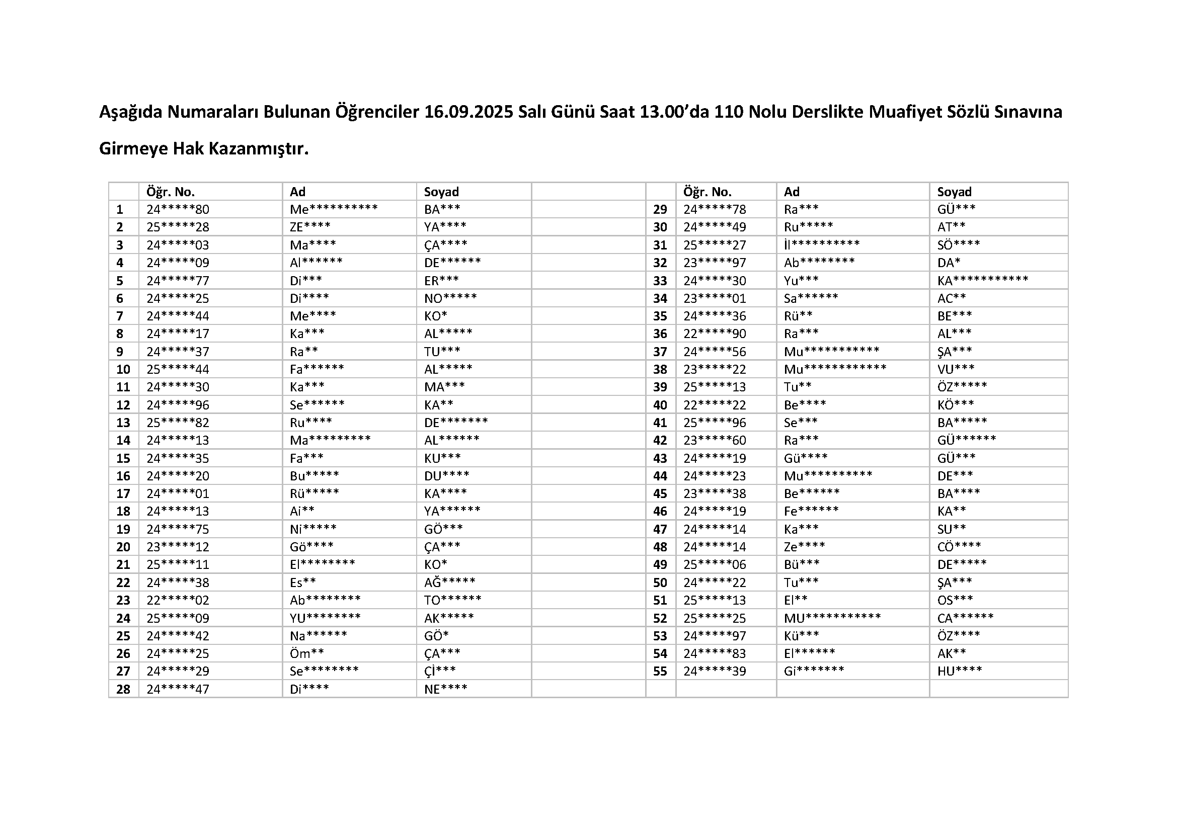 2025-2026 Hazırlık Programı Muafiyet Sınavı Sonuçları