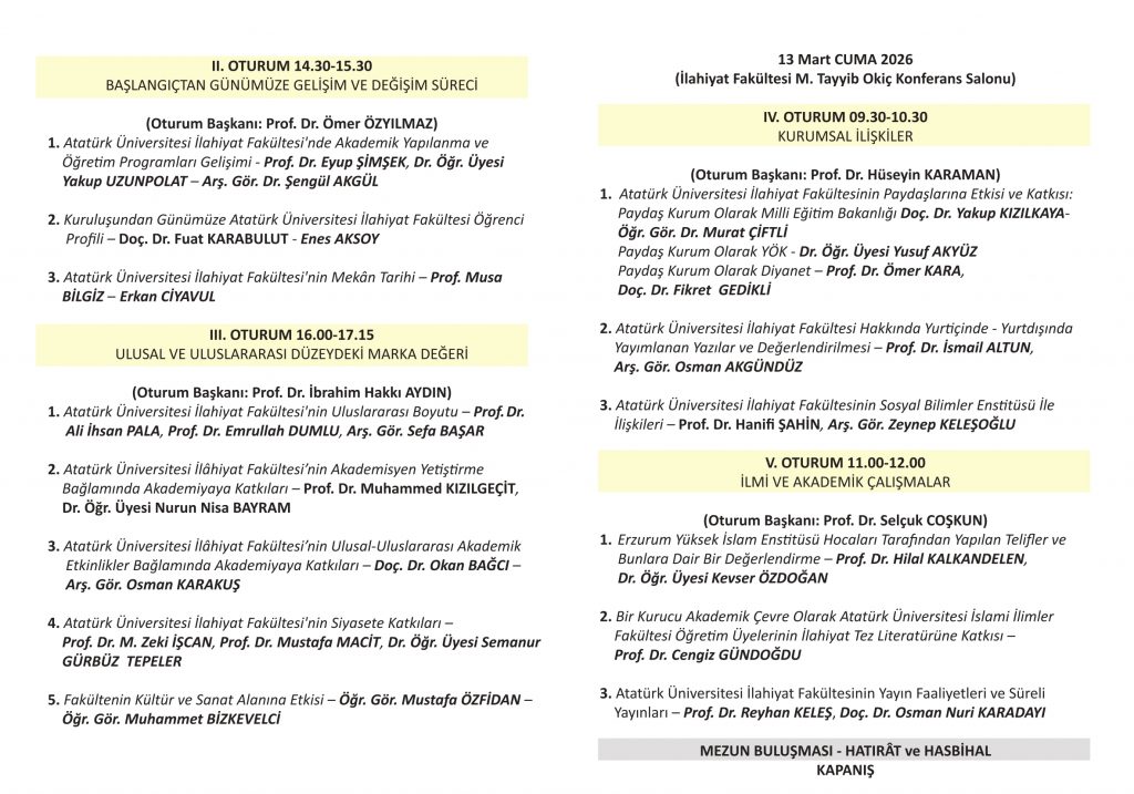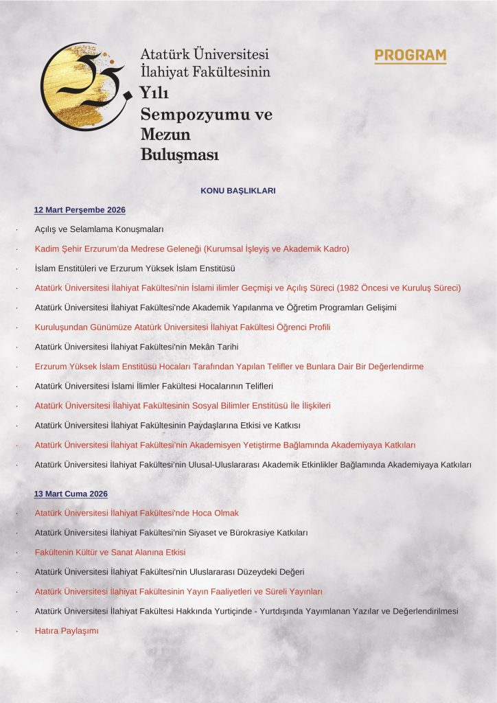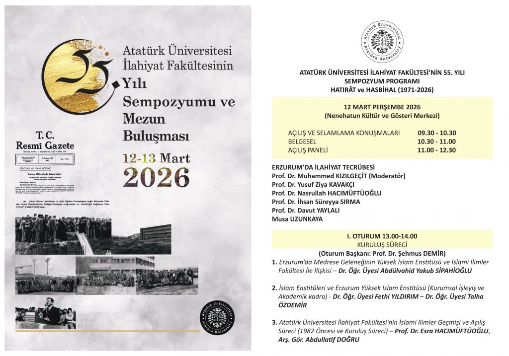 tarihlerinde “Atatürk Üniversitesi İslâmî İlimler–İlahiyat Fakültesi 55. Yılı Sempozyumu (1971–2026) / Hatırât ve Hasbihal” başlıklı bir program düzenlenmesi planlanmaktadır.