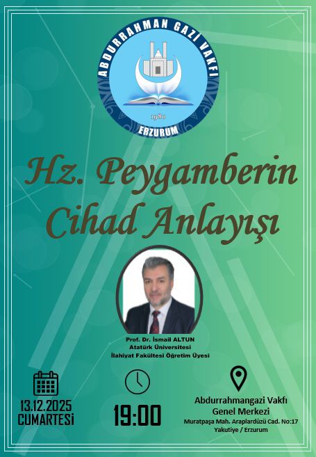 Fakültemiz öğretim üyesi Prof. Dr. İsmail ALTUN, 13 Aralık 2025 ve 20 Aralık 2025 Tarihlerinde Erzurum Abdurrahman Gazi Vakfında vatandaşlarımıza yönelik “Hz. Peygamber in Cihad Anlayışı” konulu bir sunum gerçekleştirdi.