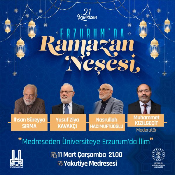 11 Mart 2026 “Erzurum’da Ramazan Neşesi” programı çerçevesinde “Medreseden Üniversiteye Erzurum’da İlim” başlıklı bir söyleşi gerçekleştirilecek