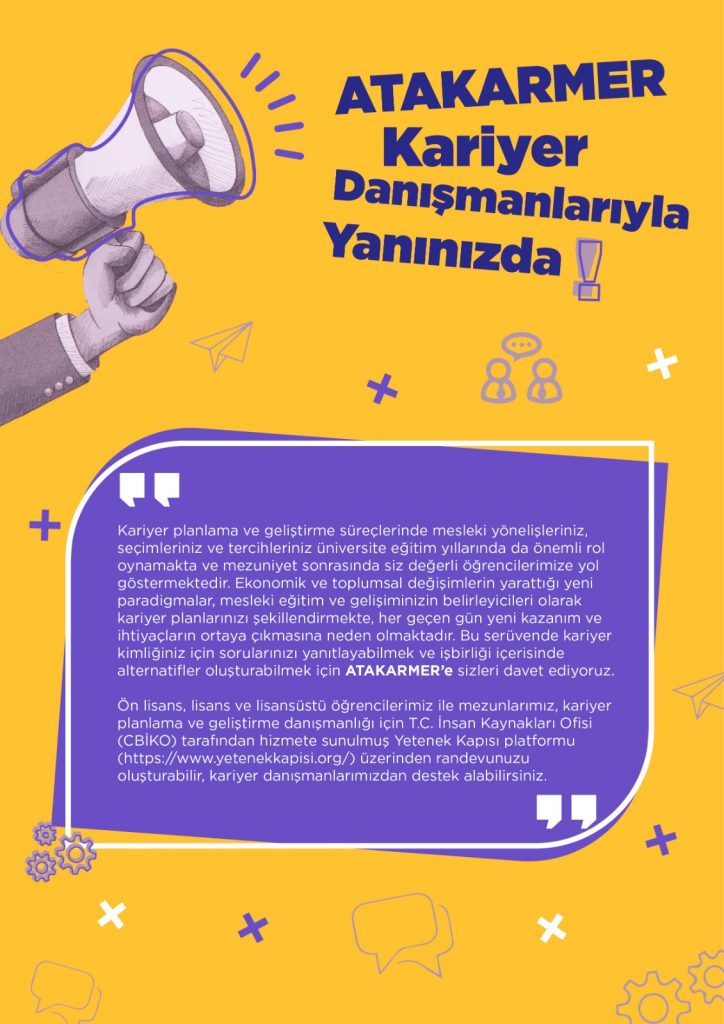 Atatürk Üniversitesi Kariyer Merkezi olarak üniversite öğrencilerimize ve mezunlarımıza yönelik bireysel kariyer danışmanlığı hizmeti sunarak hedeflerine giden yolda onlara rehberlik etmeyi önemsiyor ve hem kariyer planlama hem de kariyer geliştirme hizmetlerimizle destek olmaya çalışıyoruz.