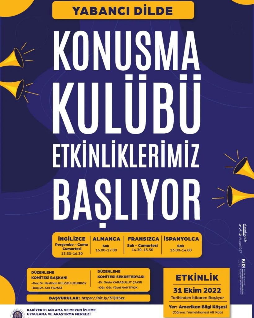 Konuşma kulübü başvuruları, ataunikariyer kullanıcı isimli resmi instagram sayfamızdan alınmaktadır. 2023-2024 Eğitim Öğretim yılı Güz Dönemi başvuruları için instagram hesabımızın takip edilmesi gerekmektedir.