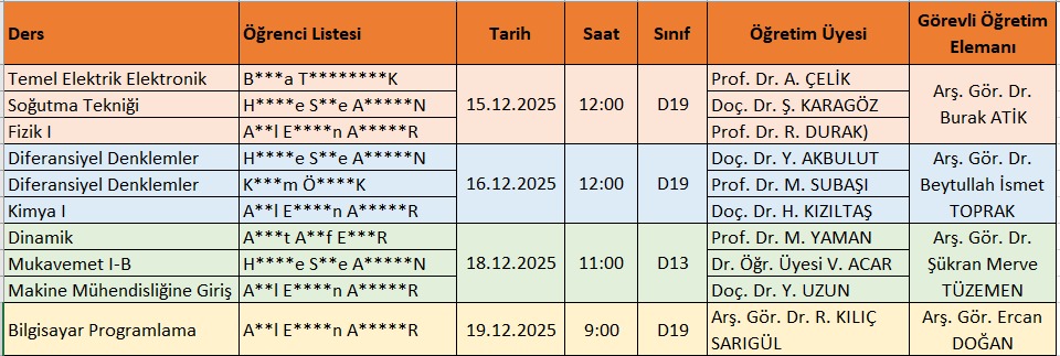 Mazeret Sınav Takvimi