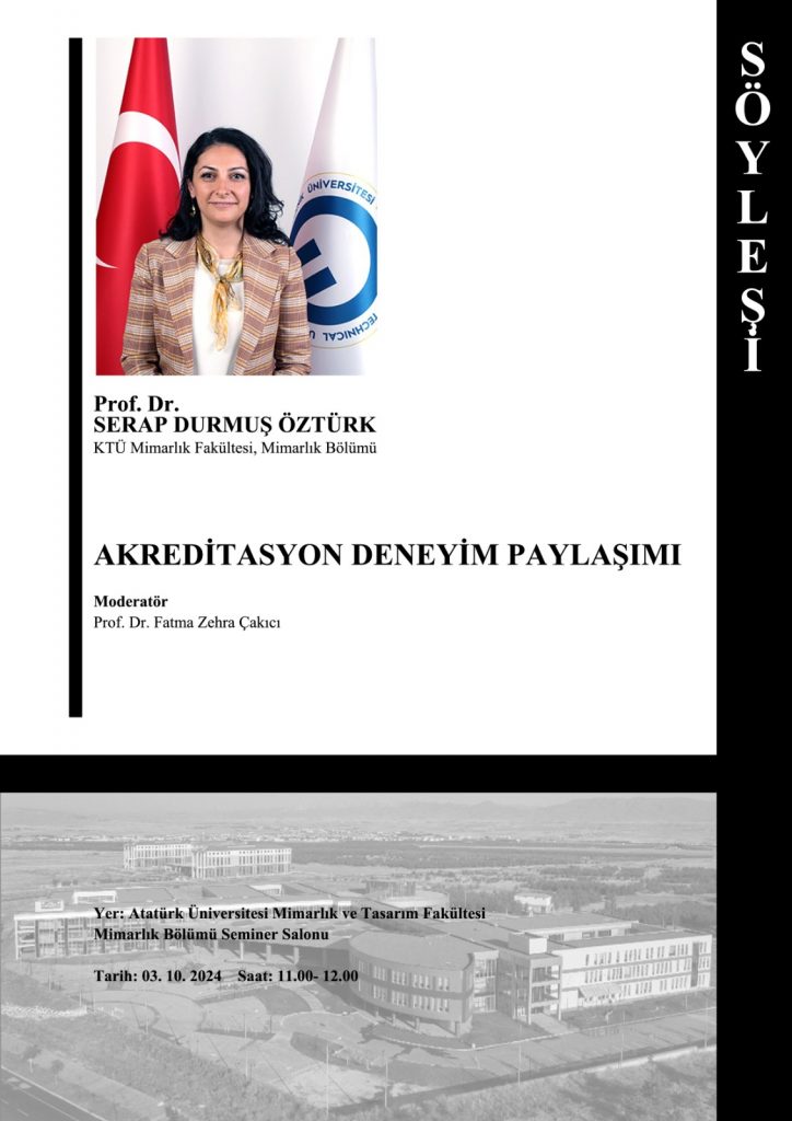 Karadeniz Teknik Üniversitesi Mimarlık Bölümü öğretim üyelerinden Prof. Dr. Serap Durmuş Öztürk, akreditasyon sürecinde rol alan ve akredite olmuş bir bölümün üyesi olarak deneyim paylaşımında bulunacaktır. 3 Ekim 2024 Perşembe günü saat 11:00’de Mimarlık Bölümü Seminer Salonunda gerçekleştirilecek ve modaratörlüğünü Mimarlık Bölüm başkanı Prof. Dr. Fatma Zehra Çakıcı’nın yapacağı söyleşiye fakültemiz ve bölümümüz akademik personeli davetlidir.