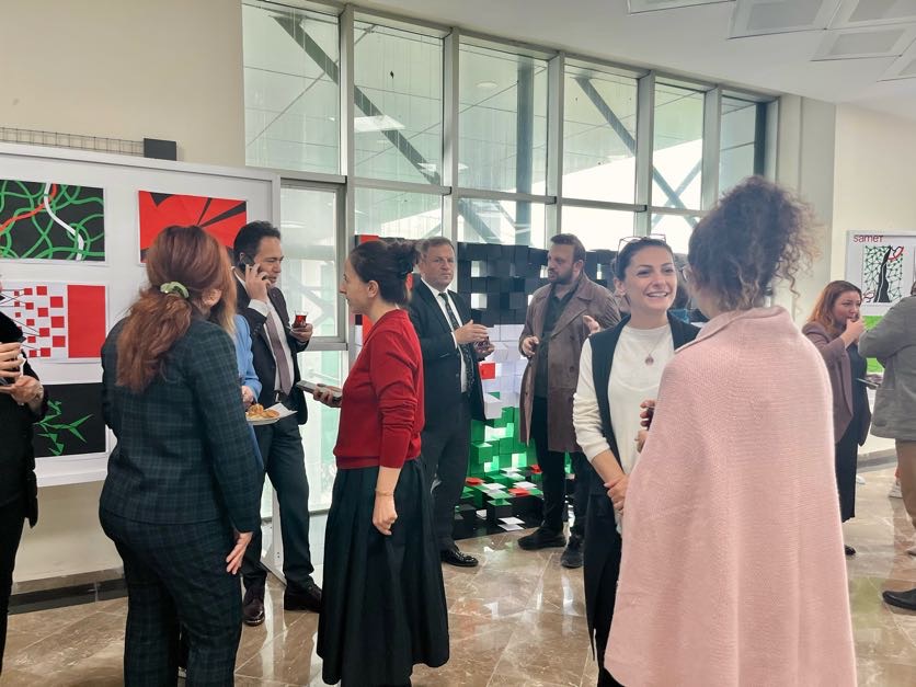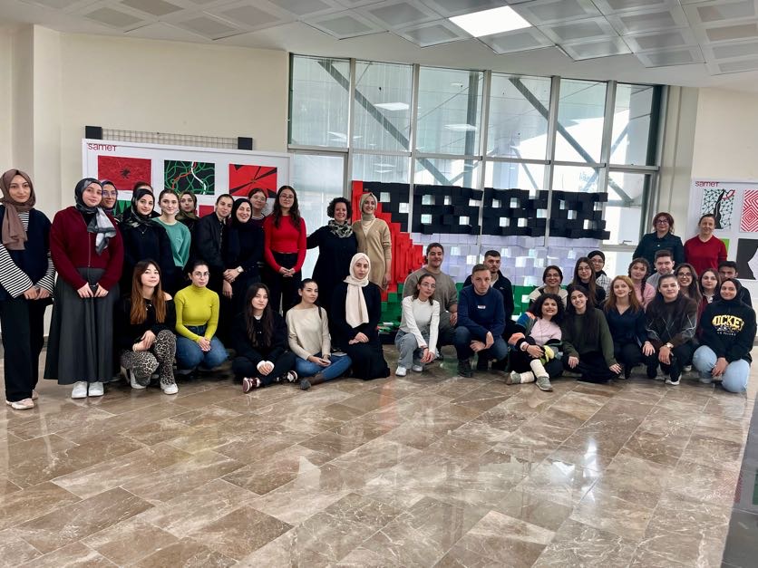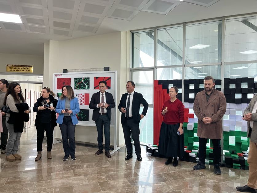 Sergi, birinci sınıf öğrencilerinin stüdyo dersleri kapsamında soykırım ve direniş farkındalığını artırmak için hazırladığı Filistin temalı iki boyutlu soyutlama çalışmaları ve enstalasyon çalışmasıyla başladı. Mimarlık Bölümü olarak, sergiye yoğun ilgi gösteren tüm davetlilere ve katılımcılara teşekkür ederiz.