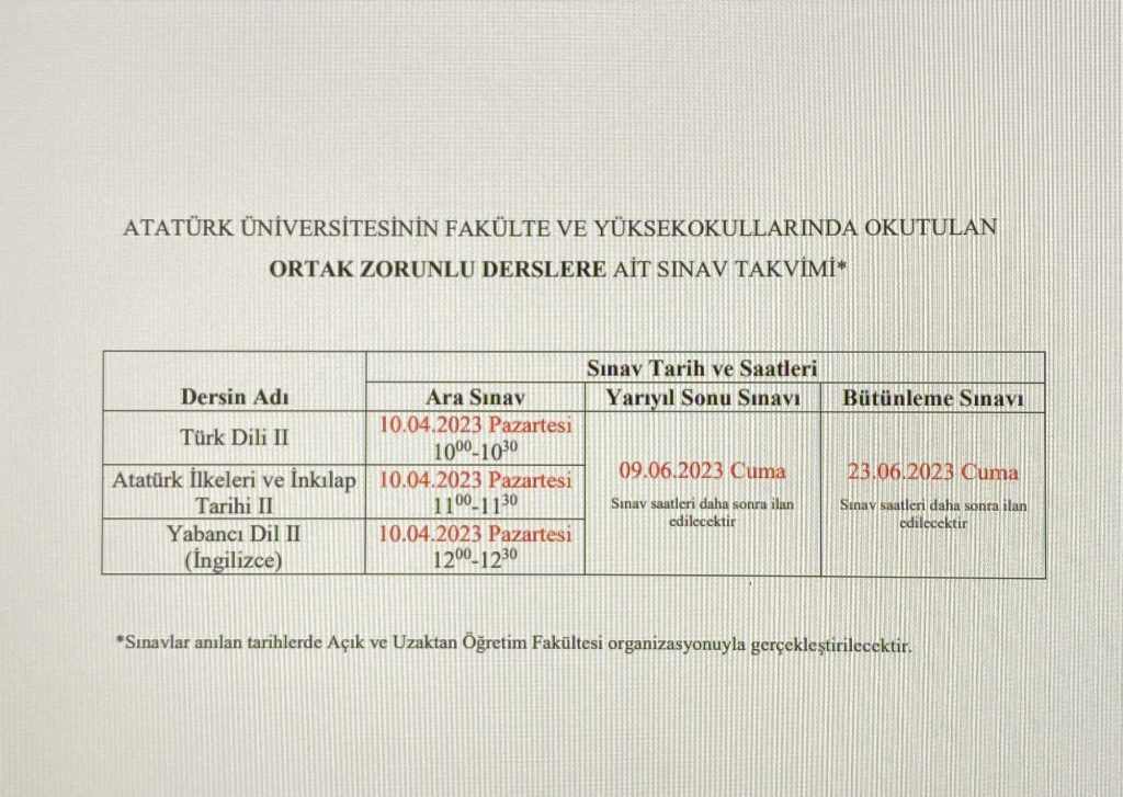 2022-23 Bahar Yarıyılı Ortak Zorunlu Dersler Vize Sınav Takvimi