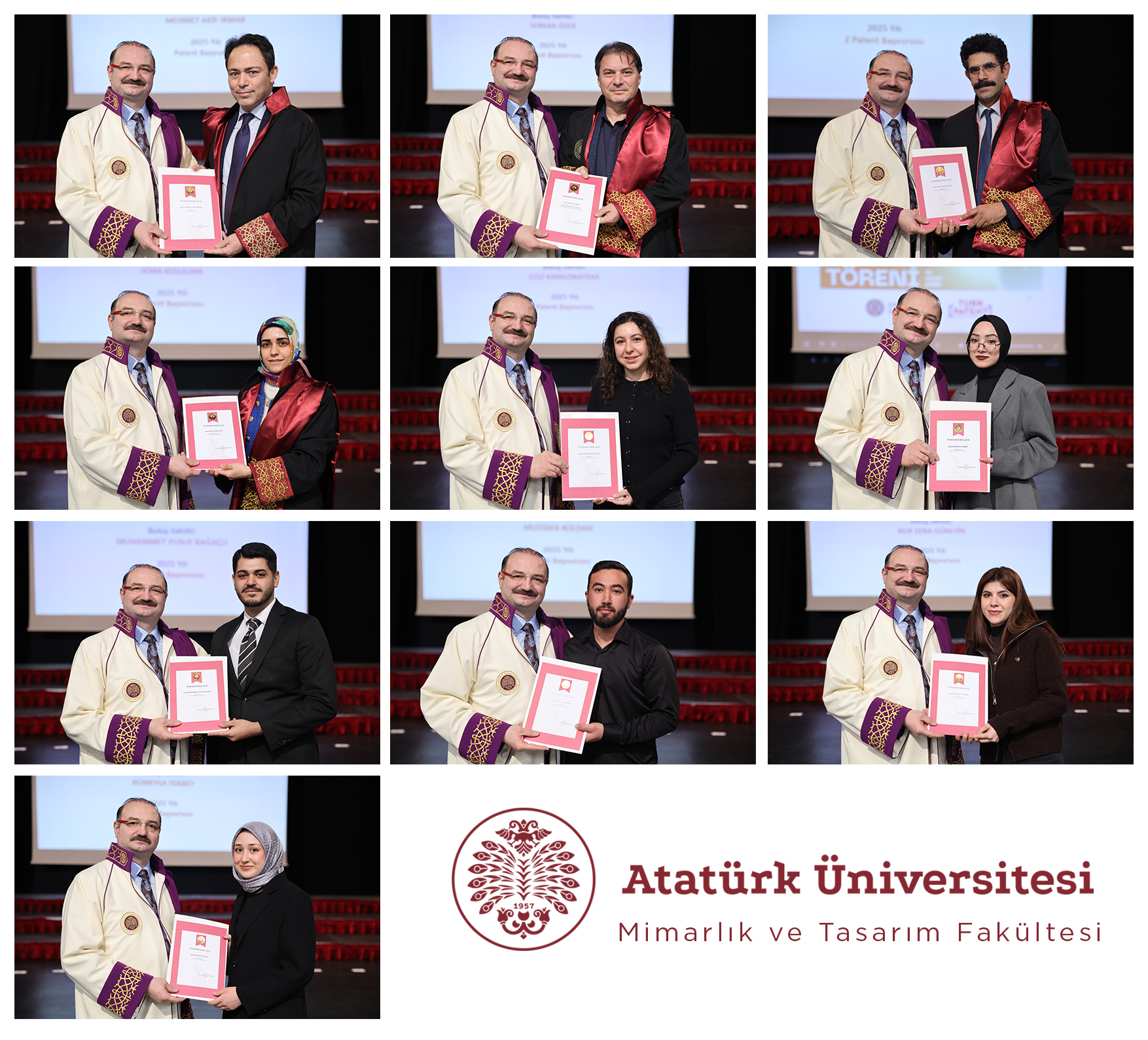 Atatürk Üniversitesi Mimarlık ve Tasarım Fakültesi öğretim elemanları ve öğrencileri, patent ve tasarım tescili çalışmalarıyla önemli bir başarı elde etmiştir. Fakülte Dekanı Prof. Dr. Mehmet Akif IRMAK’ın yanı sıra Peyzaj Mimarlığı Bölümü akademisyenlerinden Prof. Dr. Serkan ÖZER ve Arş. Gör. Dr. Ali Can KUZULUGİL ile Mimarlık Bölümü akademisyenlerinden Arş. Gör. Sema KIZILELMA’nın bireysel ve özgün çalışmaları, Peyzaj Mimarlığı lisans öğrencilerinin katkılarıyla gerçekleştirilmiştir. Akademik bilgi ile tasarım pratiğini buluşturan bu nitelikli üretimler, fakültenin bilimsel ve yaratıcı kapasitesini ortaya koymaktadır. Söz konusu çalışmalar, üniversitemiz tarafından düzenlenen Patent ve Faydalı Model Belge Takdim Töreni’nde takdir edilmiştir. Mimarlık ve Tasarım Fakültesi öğretim kadrosu ve öğrencileri, törende Rektörümüz Prof. Dr. Ahmet HACIMÜFTÜOĞLU’ndan teşekkür belgesi almıştır.