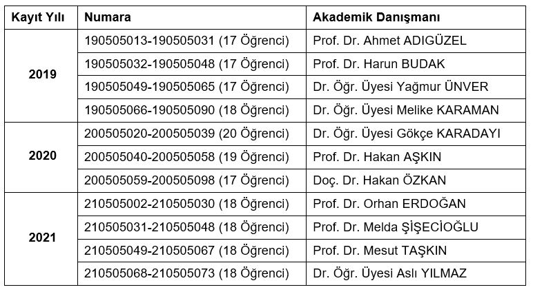 Bölümümüzü tercih eden öğrencilerin üniversite yaşamlarında ve daha sonrasında bilinçli karar alabilmelerini sağlayabilmek için onları doğru bilgilendirmek, akademik ve mesleki ilgi alanlarına yönlendirebilmek amacıyla 2019 yılı güz dönemi itibariyle sınıf danışmanlıklarına ek olarak Akademik Danışmanlık uygulanmaktadır.