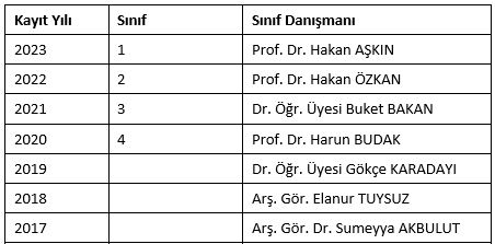 Sınıf danışmanlarımız Atatürk Üniversitesi Danışmanlık Uygulama Esasları gereğince bölümümüze kayıt yaptıran öğrencilerimize 4 yıllık lisans öğrenimleri süresince ders seçimi, öğrenci hareketliliği, kariyer planlama vb. konularda rehberlik etmek üzere her sınıf düzeyi için görevlendirilen 1 öğretim üyesinden oluşmaktadır.