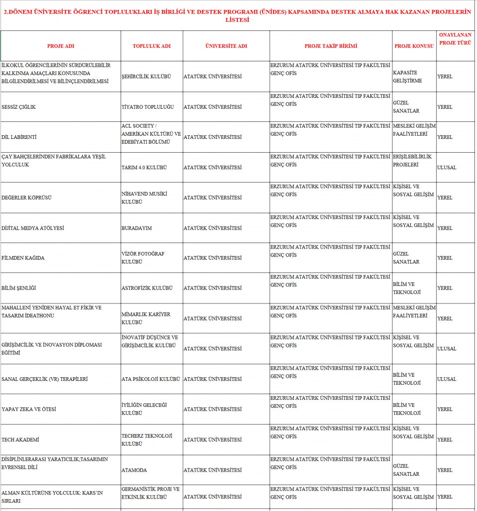 13 Ocak 2025 Atatürk Üniversitesi’nden ÜNİDES’e Rekor Başvuru Üniversite öğrenci topluluklarının projelerine destek sağlamak amacıyla, Gençlik ve Spor Bakanlığı tarafından yürütülen ÜNİDES Programı ikinci dönem sonuçları açıklandı. Atatürk Üniversitesi’nden 15 öğrenci kulübü projeleriyle destek almayı başardı.