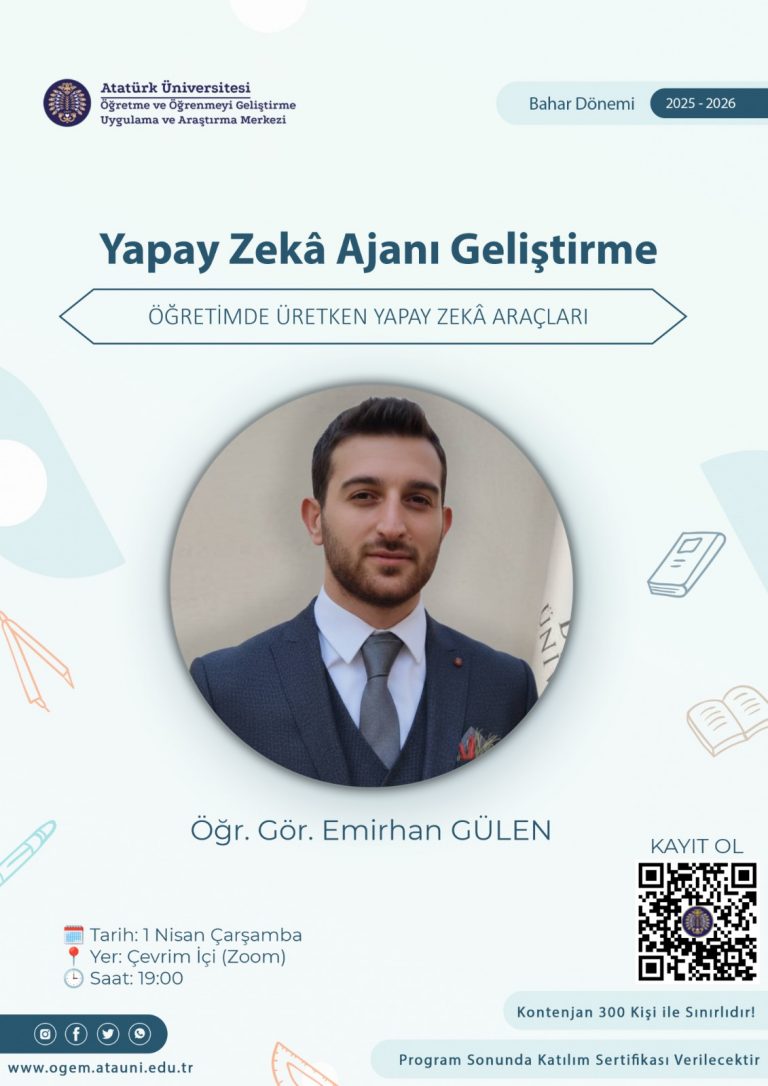 Atatürk Üniversitesi Öğretme ve Öğrenmeyi Geliştirme Uygulama ve Araştırma Merkezi (ÖGEM) tarafından düzenlenen “Öğretimde Üretken Yapay Zekâ Araçları” webinar serisi devam ediyor.