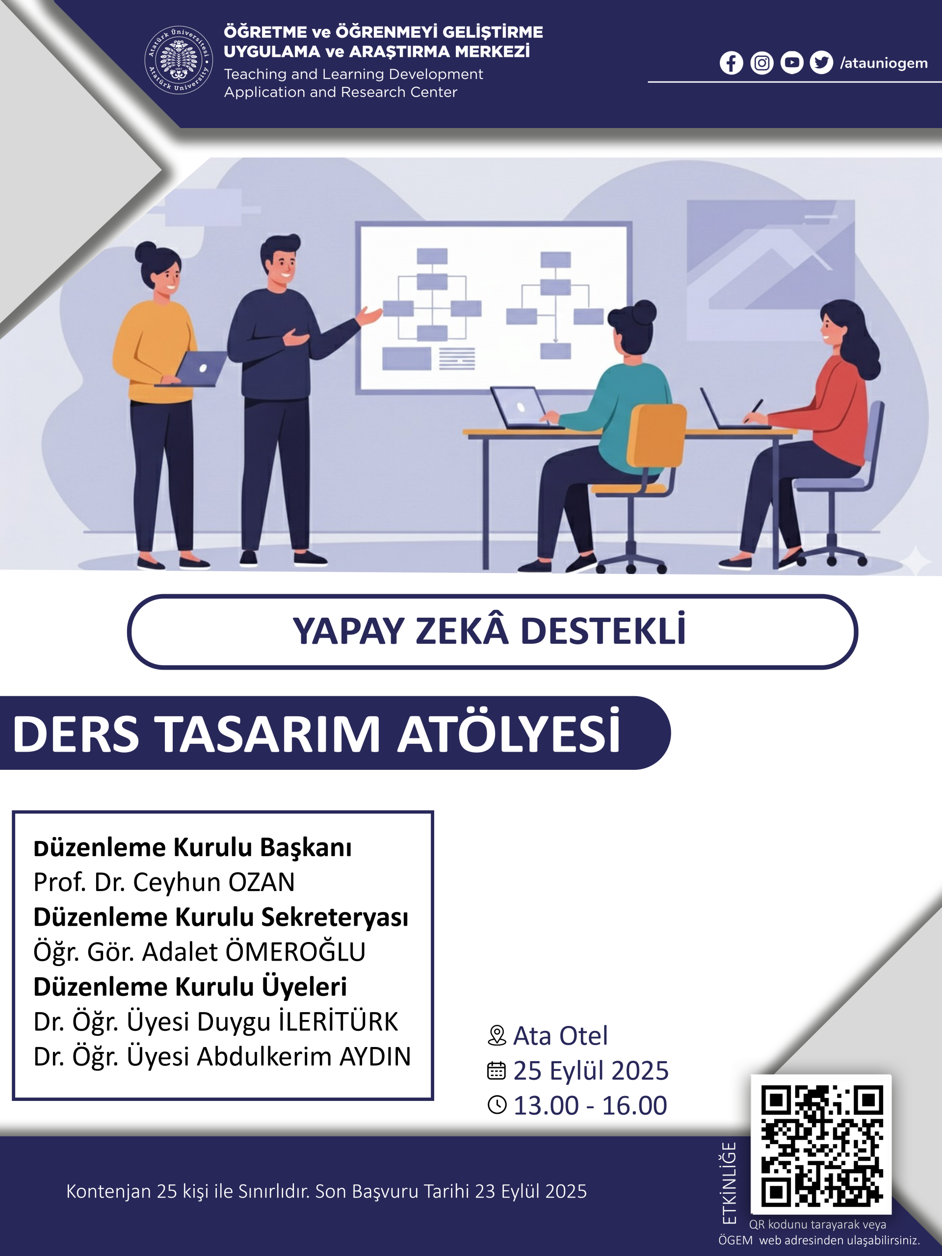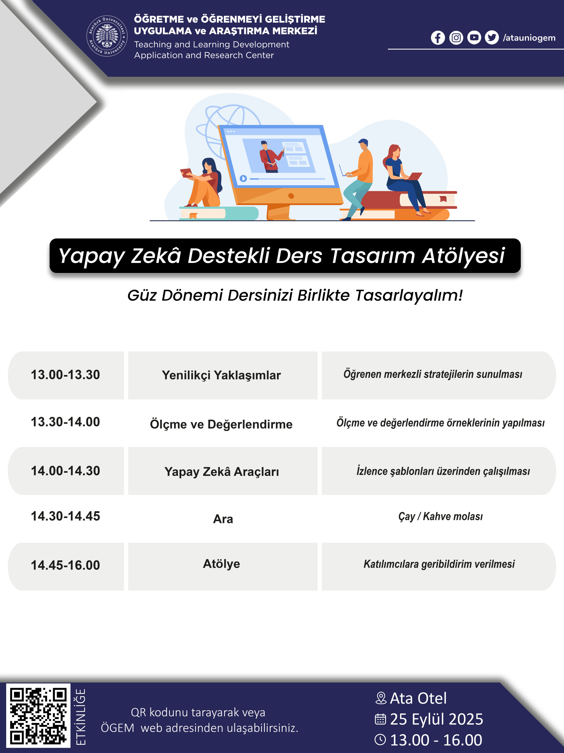 ÖGEM tarafından 25 Eylül 2025 tarihinde üniversitemiz akademisyenlerine yönelik olarak yüz yüze “Yapay Zekâ Destekli Ders Tasarım Atölyesi” düzenlenmesi planlanmaktadır.