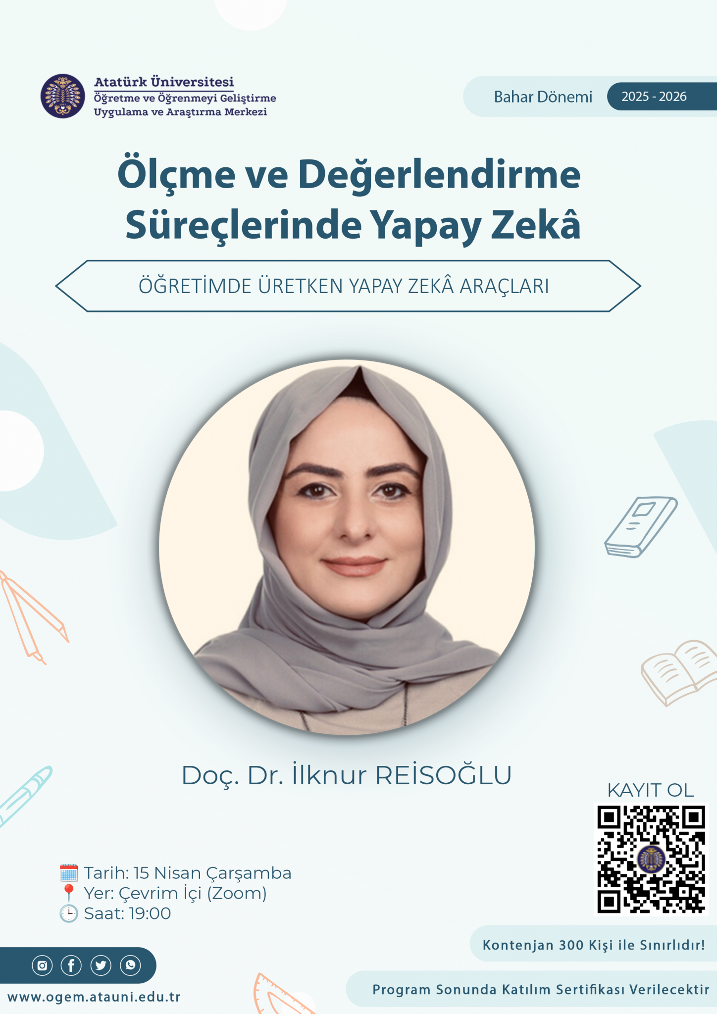 Atatürk Üniversitesi Öğretme ve Öğrenmeyi Geliştirme Uygulama ve Araştırma Merkezi tarafından, “Öğretimde Üretken Yapay Zekâ Araçları” kapsamında düzenlenen Ölçme ve Değerlendirme Süreçlerinde Yapay Zekâ Eğitimi, katılımcılarla çevrim içi olarak buluşuyor.