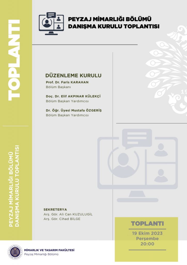 Atatürk Üniversitesi Mimarlık ve Tasarım Fakültesi Peyzaj Mimarlığı Bölümü Danışma Kurulu Toplantısı 19 Ekim 2023 Perşembe günü yoğun bir katılımla gerçekleştirilmiştir. Bu şekilde Peyzaj Mimarlığı Bölümü Danışma Kurulu ilk toplantısını çevrimiçi olarak yapmış oldu. Danışma Kurulu Üyeleri bölüm başkanı tarafından takdim edildikten sonra sırasıyla görüşlerini belirtmişlerdir. Bu programa bölümümüzün kuruluşundan beri çeşitli kademelerde görev yapan Prof. Dr. Hasan Yılmaz, öğretim üyelerinden Prof. Dr. Işık Sezen, Ankara Üniversitesi Ziraat Fakültesi Peyzaj Mimarlığı Bölümü emekli öğretim üyesi Prof. Dr. Mükerrem Arslan, Çağlayan Bilim Kültür ve Sanat Derneğini temsilen Doç. Dr. Neslihan Demircan, Peyzaj Mimarları Derneği Yönetim Kurulu Başkanı Gündüz Atilla Tosun, Erzurum Kalkınma Vakfı (ER-VAK) adına Doç. Dr. Emre Çomaklı, İstanbul Teknik Üniversitesi Mimarlık Fakültesi Peyzaj Mimarlığı Bölümünden Araş. Gör. Merve Aydınlı, İzmir Demokrasi Üniversitesi Mimarlık ve Tasarım Fakültesi Peyzaj Mimarlığı Bölümünden Arş. Gör. Recep ÖZMISIR, Erzurum Büyükşehir Belediyesi Park ve Bahçeler Bakım Onarım Şube Müdürü Mehmet Tercan, Antalya İl Tarım ve Orman Müdürlüğü’nden Yüksek Peyzaj Mimarı Başak Bezmiş, Türkiye Büyük Millet Meclisi (TBMM) milletvekili danışmanı Betül Aykun Dikmen, Erzurum İl Gençlik ve Spor Müdürlüğü’nden Mehmet Emin Daş, ABT Tasarım Uygulama ve Proje Yönetim Ltd. Şti.’den Ayşenur Bölükbaşı, Yusufeli Fidancılık’tan Kadir Yaşar, Fen Bilimleri Peyzaj Mimarlığı Ana Bilim Dalı doktora öğrencileri Zahra Ghannadian ve Oğuz Gökçe, Almanya’da faaliyetlerini yürüten Özgür Köstereli ve Peyzaj Mimarlığı Bölümü Lisans Programı öğrencisi Kürşat Aydın katılım sağlamış ve görüşlerini belirtmişlerdir. Çevrimiçi programın Bölüm Başkanı Prof. Dr. Faris Karahan, Bölüm Başkan Yardımcıları Doç. Dr. Elif Akpınar Külekçi ve Dr. Öğr. Üyesi Mustafa Özgeriş tarafından düzenlenirken Arş. Gör. Ali Can Kuzulugil ve Arş. Gör. Cihad Bilge sekreterya hizmetlerini yürütmüşlerdir. Bir sonraki toplantının bu programa katılamayan diğer danışma kurulu üyelerinin de katılımıyla daha geniş bir çerçevede yapılması planlanmaktadır. Atatürk Üniversitesi Peyzaj Mimarlığı Lisans Programı ve Peyzaj Mimarlığı Ana Bilim Dalı Doktora ve Tezli Yüksek Lisans Programının kalitesinin artırılması; yerel yönetim, kamu, özel sektör ve sivil toplum kuruluşlarında peyzaj mimarlarının istihdam edilebilirlik ve etkili yönetim sergilenmesi bağlamında görüş, eleştiri ve önerilerini dile getiren Danışma Kurulu Üyelerimize teşekkür ederiz.