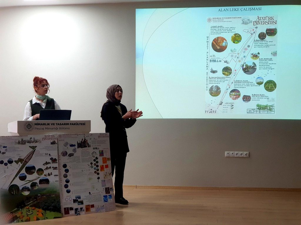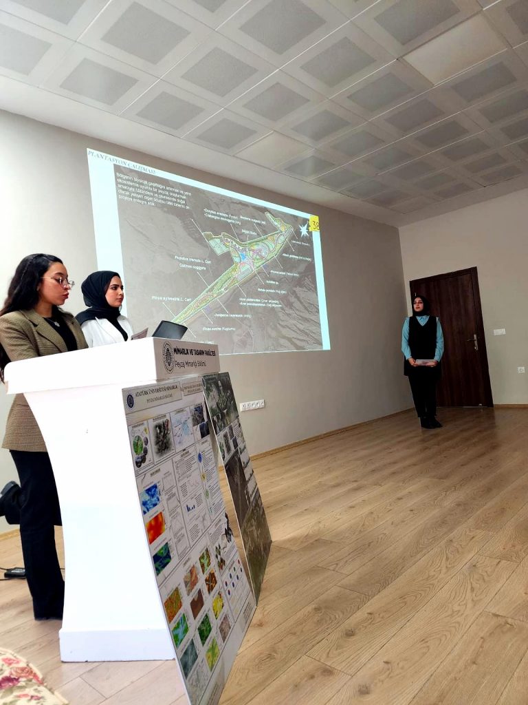 Jüri sunumlarını gerçekleştiren öğrenciler, dönem boyunca Tortum Gölü Havzası’nda yaptıkları saha çalışmaları ve akademik analizler doğrultusunda kapsamlı bir planlama süreci yürütmüşlerdir. Öğrenciler, bu süreçte danışman öğretim üyelerinden, Uzundere Belediyesi ve Uzundere Kaymakamlığı’ndan, ayrıca sürecin farklı aşamalarında katkı sunan tüm paydaşlardan destek görmüşlerdir. Peyzaj Mimarlığı Bölümü olarak, farklı planlama yaklaşımları ile süreci sonuçlandıran öğrencilerimize, idari ve lojistik açıdan kolaylaştıran ve destekleyen Mimarlık ve Tasarım Fakültesi Dekanlığına ve Atatürk Üniversitesi Rektörlüğüne, Uzundere ilçesinde paydaş toplantılarını organize ederek bilgilendirme çalışmalarını koordine eden Uzundere Kaymakamlığı ve Uzundere Belediyesine içtenlikle teşekkür ederiz.