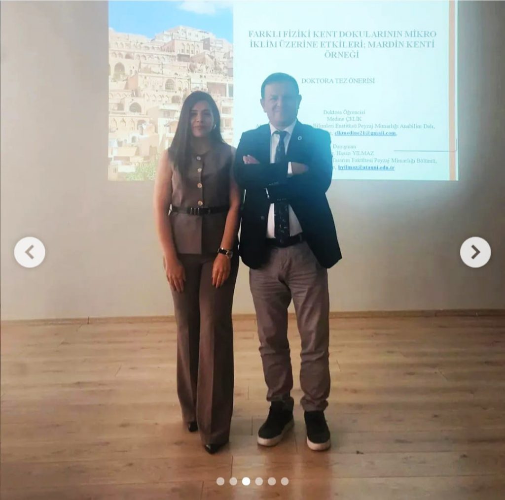 Doktora programı öğrencimiz Medine Çelik, danışmanı Prof. Dr. Hasan Yılmaz rehberliğinde hazırladığı “Farklı Fiziki Kent Dokularının Mikro İklim Üzerine Etkileri; Mardin Kenti Örneği” başlıklı tez önerisi sunumunu gerçekleştirdi.