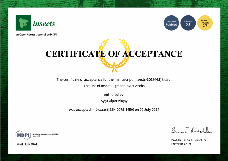 Güzel Sanatlar Fakültesi Resim Bölümü öğretim üyelerinden Prof. Dr. Ayça ALPER AKÇAY, SCIE (Science Citation Index Expanded) indeksinde taranan ve Q1 kategorisinde impact faktörü 2.7 olan Insects adlı dergide yayımlanan “The use of insect pigment in art works” adlı makalesiyle Güzel Sanatla alanında Bilimsel Teşvik Ödülü aldı. Ödülünü Atatürk Üniversitesi Rektörü Prof. Dr. Ahmet HACIMÜFTÜOĞLU’ndan alan Akçay’ın makalesine ulaşmak için tıklayın.