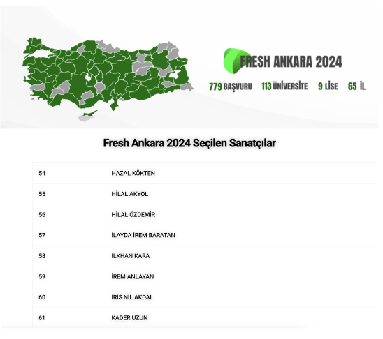 - Doç. Evren Kavukcu’nun danışmanlığındaki Yüksek Lisans öğrencisi Kader Uzun, 24-29 Eylül 2024 tarihlerinde “Fresh Ankara” Sergisi’ne ve Yüksek Lisans öğrencisi Semiha Karaca, aynı danışmanın rehberliğinde, “Base” Sergisi’nde eserlerini sergilemeye hak kazanmıştır.