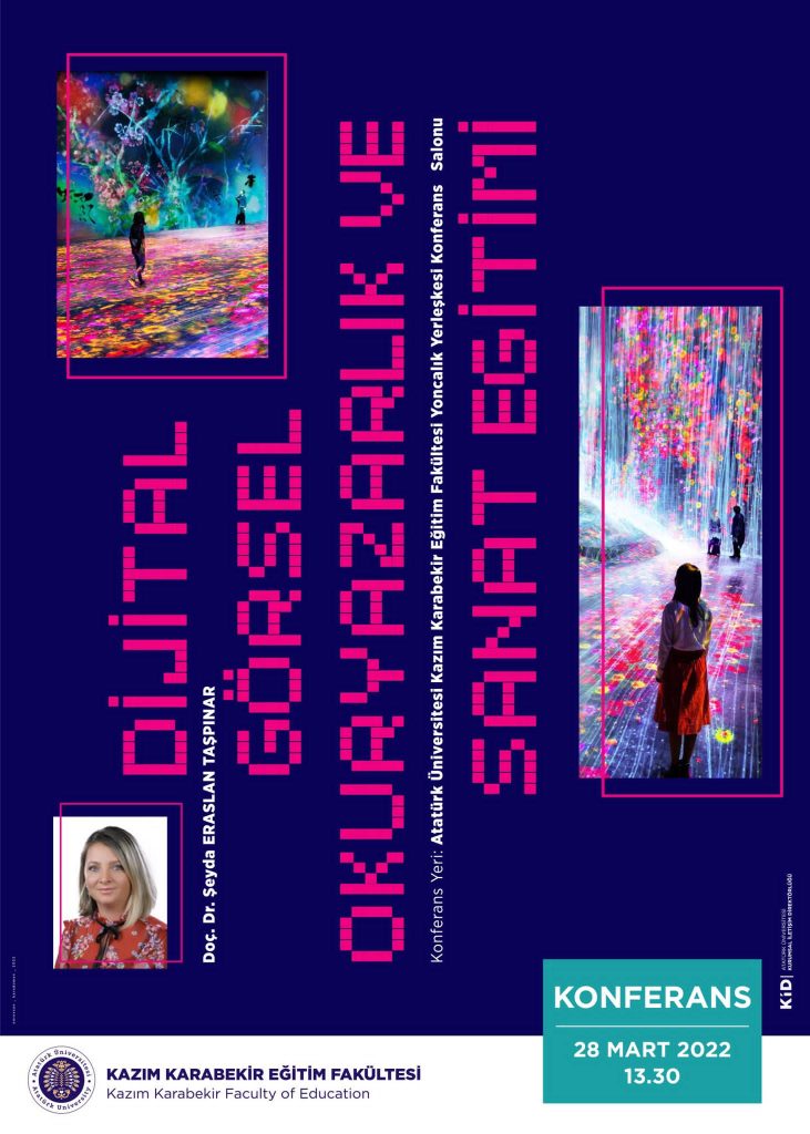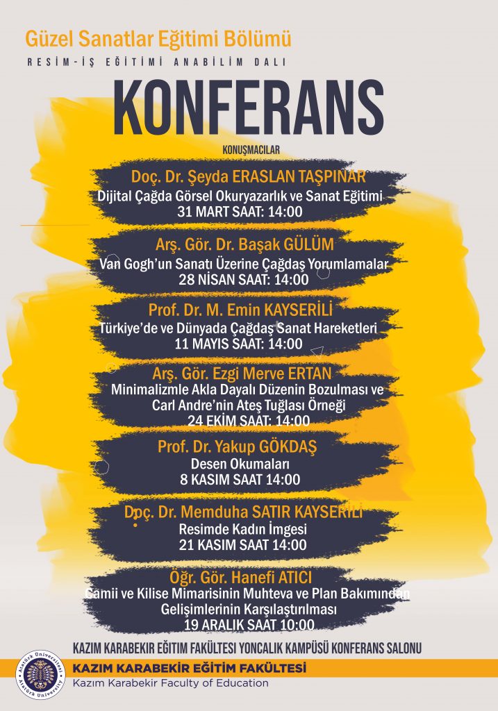 9 Mayıs 2022 Konferans Dizisi Güzel Sanatlar Eğitimi Resim-iş Eğitimi Anabilim Dalı bünyesindeki öğretim elemanları tarafından çeşitli konferanslar düzenlenmektedir. Doç. Dr. Şeyda ERASLAN TAŞPINAR Yoncalık Kampüsü Konferans Salonu'nda dijital çağda görsel okuryazarlık ve sanat eğitimi konulu konferans vermiştir. Prof. Dr. M. Emin KAYSERİLİ, Yoncalık Kampüsü Konferans Salonu'nda Türkiye'de ve dünyada çağdaş sanat hareketleri konulu konferans vermiştir.