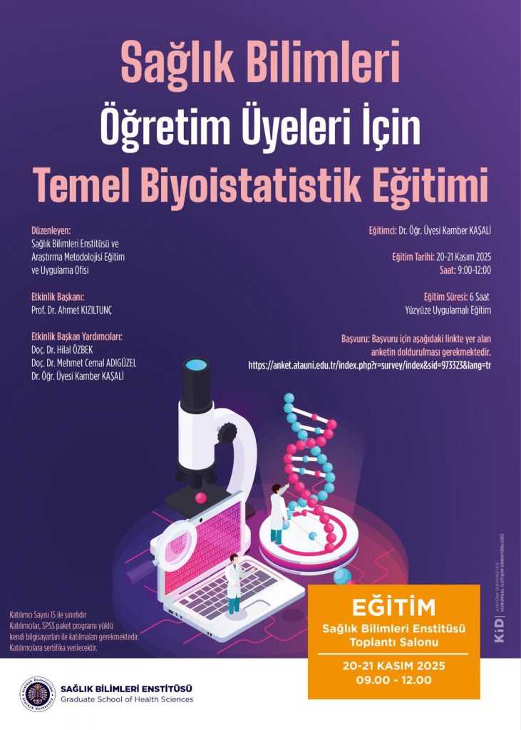 Sağlık Bilimleri Enstitüsü ve Araştırma Metodolojisi Eğitim ve Uygulama Ofisi tarafından, öğretim üyelerine yönelik 20 ve 21 Kasım 2025 tarihlerinde saat 09:00-12:00 arasında (toplam 6 saat) yüz yüze sertifikalı Temel Biyoistatistik Eğitimi düzenlenecektir. Başvuru için aşağıdaki bağlantı üzerinden başvuru formunun doldurulması gerekmektedir: https://anket.atauni.edu.tr/index.php?r=survey/index&sid=973323&lang=tr