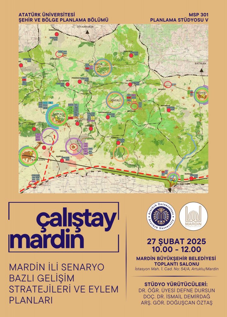 Bölümümüz 3.sınıf öğrencileri ile Planlama Stüdyosu VI (MSP302) dersi kapsamında gerçekleştirilen Mardin Artuklu teknik gezisi son ermiştir. Teknik gezi kapsamında Mardin Büyükşehir Belediyesi’nde Genel Sekreterin katılımıyla gerçekleştirilen çalıştayda öğrencilerimiz 1/100.000 ölçekli planlarını yetkililere sunarak görüş almıştır. Mardin Büyükşehir Belediyesi’nin katılımları ve katkıları için teşekkür ederiz.