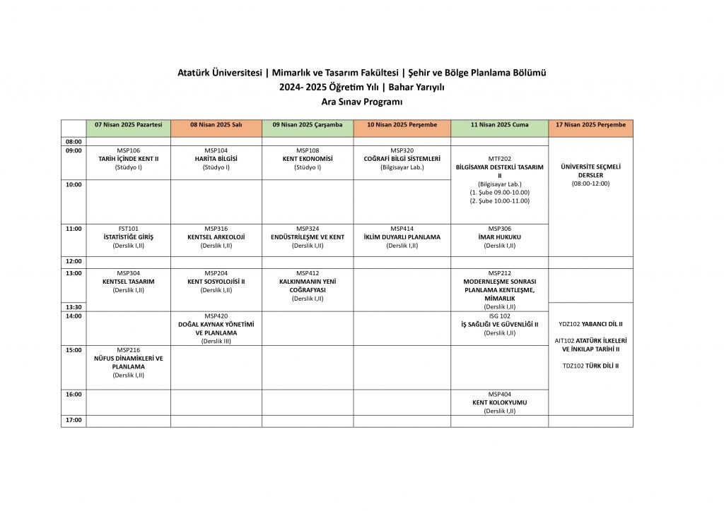 2024- 2025 Öğretim Yılı, Bahar Yarıyılı Ara Sınav Programı