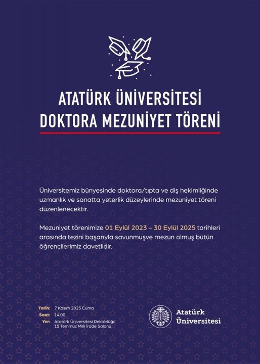 Danışmanı olduğunuz ve 1 Eylül 2023 – 30 Eylül 2025 tarihleri arasında mezun olan doktora öğrencilerinizin “En İyi Tez Ödülü” kategorisine başvurmalarını ve belirtilen tarihte öğrencinizle birlikte Mezuniyet Töreni’ne katılım sağlamanızı rica ederiz.