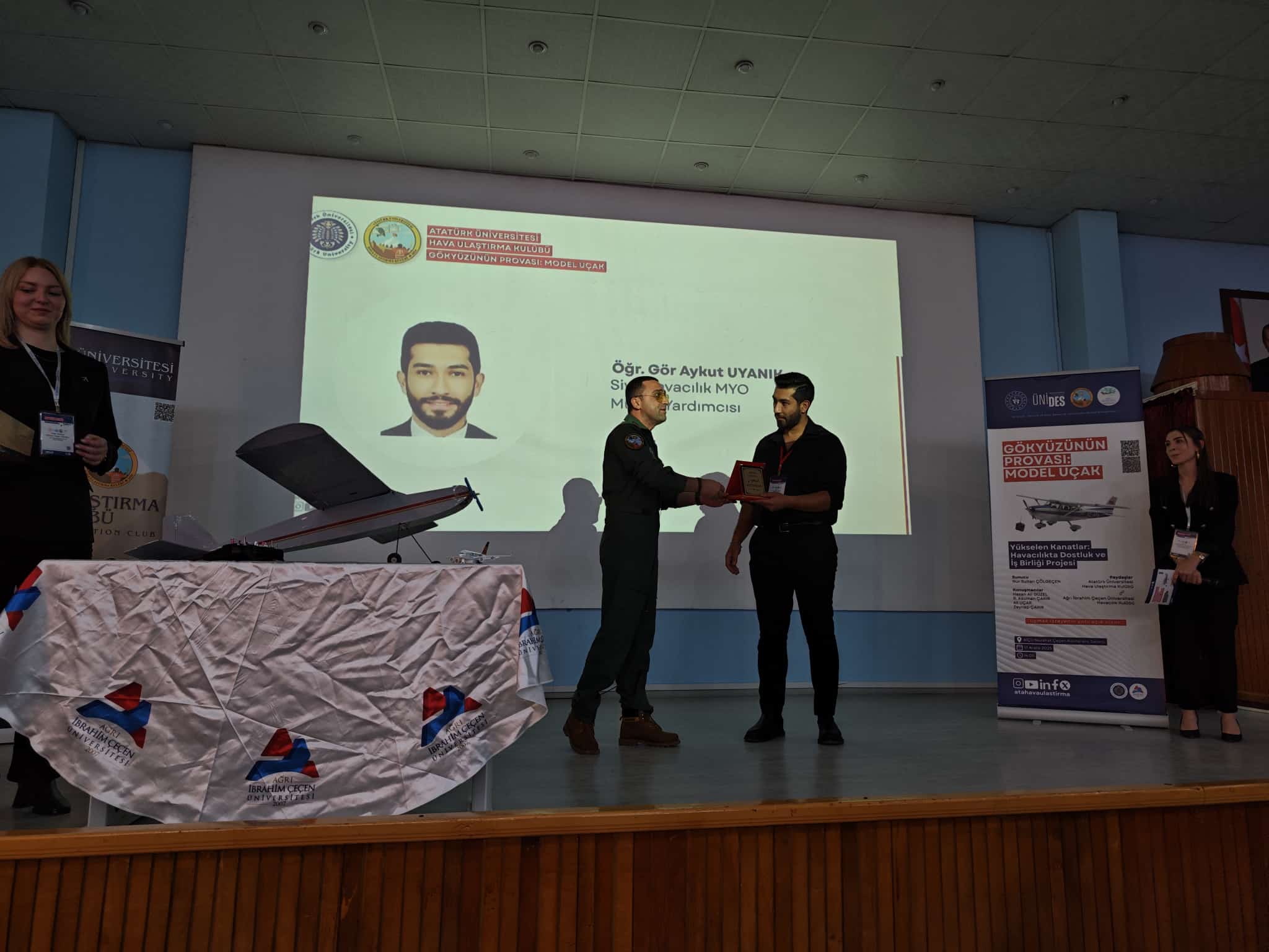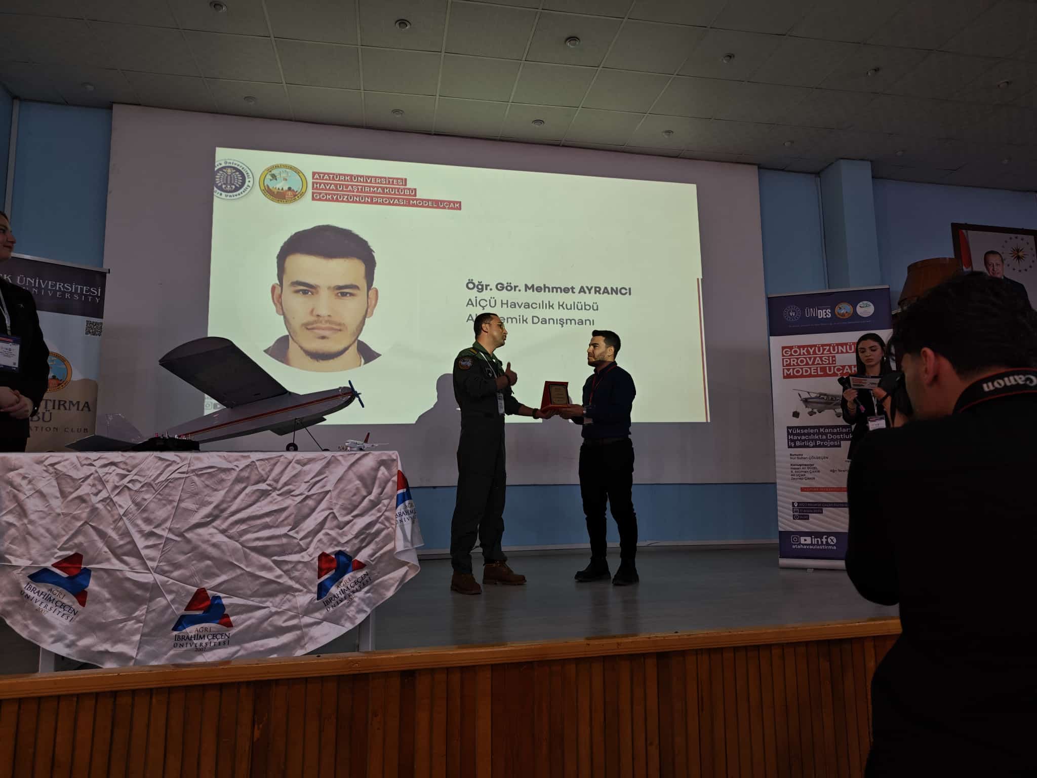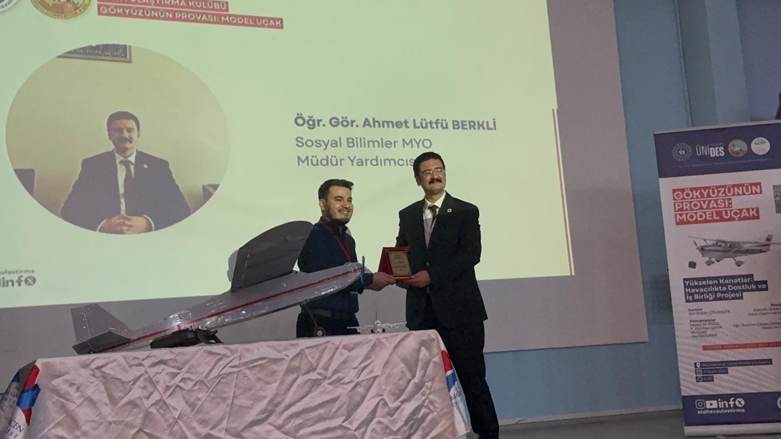 Meslek Yüksekokulumuz Hava Ulaştırma Kulübü ile Ağrı İbrahim Çeçen Üniversitesi Sivil Havacılık MYO Havacılık Kulübü iş birliğinde düzenlenen, UNİDES destekli “Gökyüzünün Provası: Model Uçak” konulu konferansa katılım sağladı. Etkinliğe, Meslek Yüksekokulumuz Müdür Yardımcısı Öğr. Gör. Ahmet Lütfü Berkli, Sivil Hava Ulaştırma Bölümü akademisyenlerimizden ve kulüp danışmanımız Öğr. Gör. Ali Uçar ile kulüp öğrencilerimiz de eşlik etti. Heyetimiz, Sivil Havacılık MYO Müdürü Prof. Dr. İhsan Nuri Demirel, Müdür Yardımcıları Öğr. Gör. Metin Şenel, Öğr. Gör. Aykut Uyanık ve Kulüp Danışmanı Öğr. Gör. Mehmet Ayrancı tarafından misafir edildi. Program, Hava Ulaştırma Kulübümüz üyelerinin sunumlarıyla devam ederken; havacılık, model uçak çalışmaları ve kulüp faaliyetleri üzerine keyifli ve verimli paylaşımlar gerçekleştirildi. Ardından okul gezisiyle eğitim altyapısı ve akademik çalışmalar hakkında bilgilendirme yapıldı.Etkinlik, emeği geçen akademisyenlere ve katılımcılara plaket takdimi ile son buldu. Üniversiteler arası iş birliğini güçlendiren, öğrencilerimizin havacılığa olan ilgisini artıran bu anlamlı organizasyonda yer almaktan mutluluk duyduk. Gökyüzünde buluşmaya devam edeceğiz
