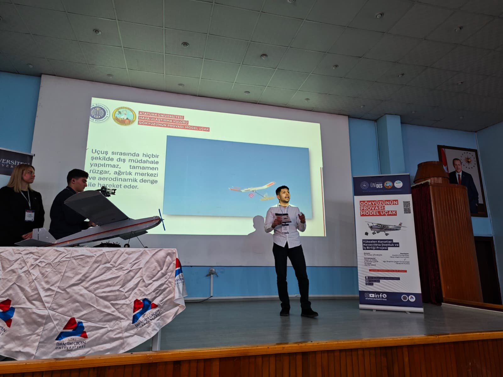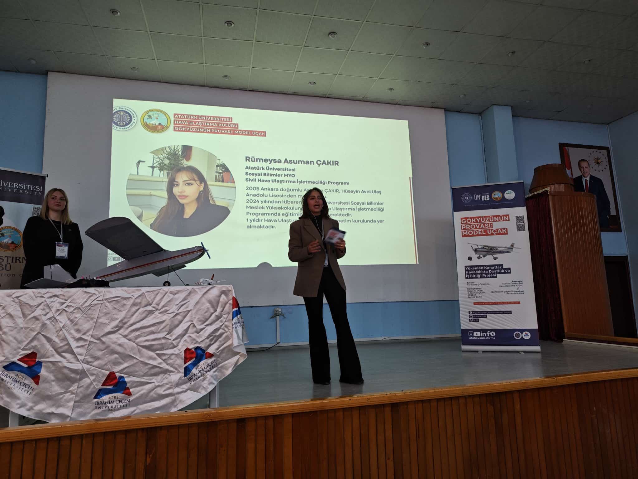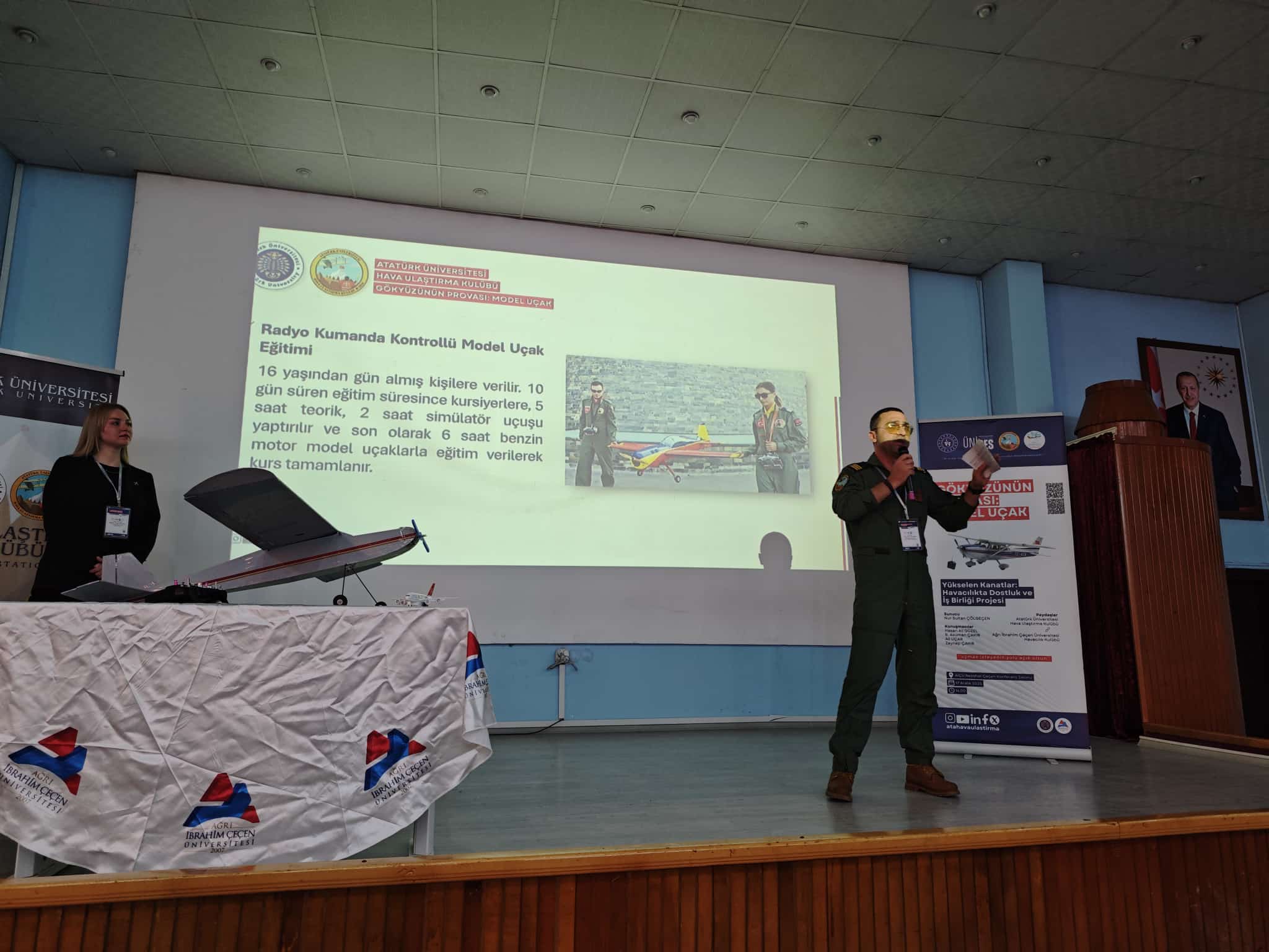 Meslek Yüksekokulumuz Hava Ulaştırma Kulübü ile Ağrı İbrahim Çeçen Üniversitesi Sivil Havacılık MYO Havacılık Kulübü iş birliğinde düzenlenen, UNİDES destekli “Gökyüzünün Provası: Model Uçak” konulu konferansa katılım sağladı. Etkinliğe, Meslek Yüksekokulumuz Müdür Yardımcısı Öğr. Gör. Ahmet Lütfü Berkli, Sivil Hava Ulaştırma Bölümü akademisyenlerimizden ve kulüp danışmanımız Öğr. Gör. Ali Uçar ile kulüp öğrencilerimiz de eşlik etti. Heyetimiz, Sivil Havacılık MYO Müdürü Prof. Dr. İhsan Nuri Demirel, Müdür Yardımcıları Öğr. Gör. Metin Şenel, Öğr. Gör. Aykut Uyanık ve Kulüp Danışmanı Öğr. Gör. Mehmet Ayrancı tarafından misafir edildi. Program, Hava Ulaştırma Kulübümüz üyelerinin sunumlarıyla devam ederken; havacılık, model uçak çalışmaları ve kulüp faaliyetleri üzerine keyifli ve verimli paylaşımlar gerçekleştirildi. Ardından okul gezisiyle eğitim altyapısı ve akademik çalışmalar hakkında bilgilendirme yapıldı.Etkinlik, emeği geçen akademisyenlere ve katılımcılara plaket takdimi ile son buldu. Üniversiteler arası iş birliğini güçlendiren, öğrencilerimizin havacılığa olan ilgisini artıran bu anlamlı organizasyonda yer almaktan mutluluk duyduk. Gökyüzünde buluşmaya devam edeceğiz