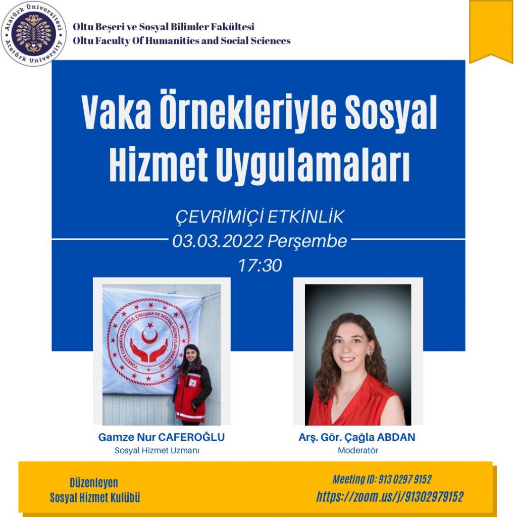 “Vaka Örnekleriyle Sosyal Hizmet Uygulamaları” isimli online etkinlik  Sosyal Hizmet Bölümü öğretim üyeleri ve öğrencilerinin katılımıyla, Zoom programı üzerinden gerçekleştirilmiştir. Bölümümüz Araştırma Görevlisi Çağla Abdan’ın moderatörlüğünde gerçekleşen etkinlikte, İstanbul Sosyal Hizmet İl Müdürlüğüne bağlı Kağıthane Sosyal Hizmet Merkezi’nde görev yapan Sosyal Hizmet Uzmanı Gamze Nur Caferoğlu tecrübelerini alandan örnek vakalar eşliğinde paylaşmıştır. Program öğrencilerin de katkılarıyla soru-cevap bölümüyle sona ermiştir.