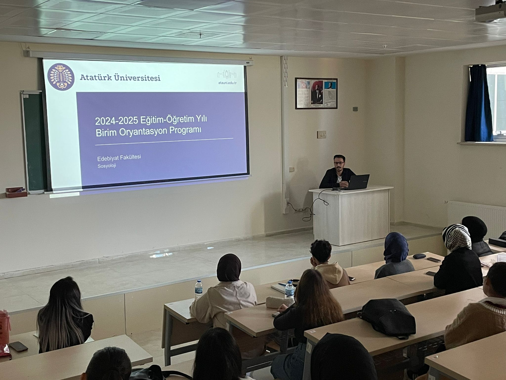 Bölüm oryantasyon programımız, 3 Ekim 2024 tarihinde 13.00-14.00 saatleri arasında Edebiyat Fakültesi A-306 numaralı derslikte Sosyoloji Bölüm Başkanı Prof. Dr. Mevlüt Özben’in konuşmaları ve Arş. Gör. Halil Demirtaş’ın sunumu ile gerçekleşmiştir. Sunum kapsamında Atatürk Üniversitesi ve Edebiyat Fakültesi hakkında bilgiler verilmiş, bölümümüzün detaylı tanıtımı yapılmıştır.