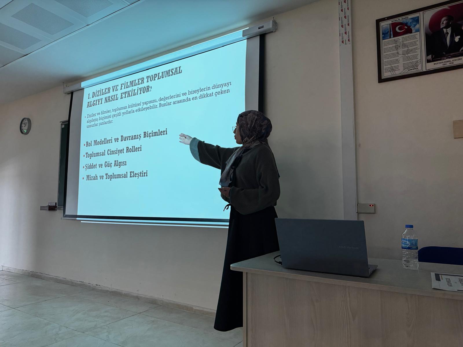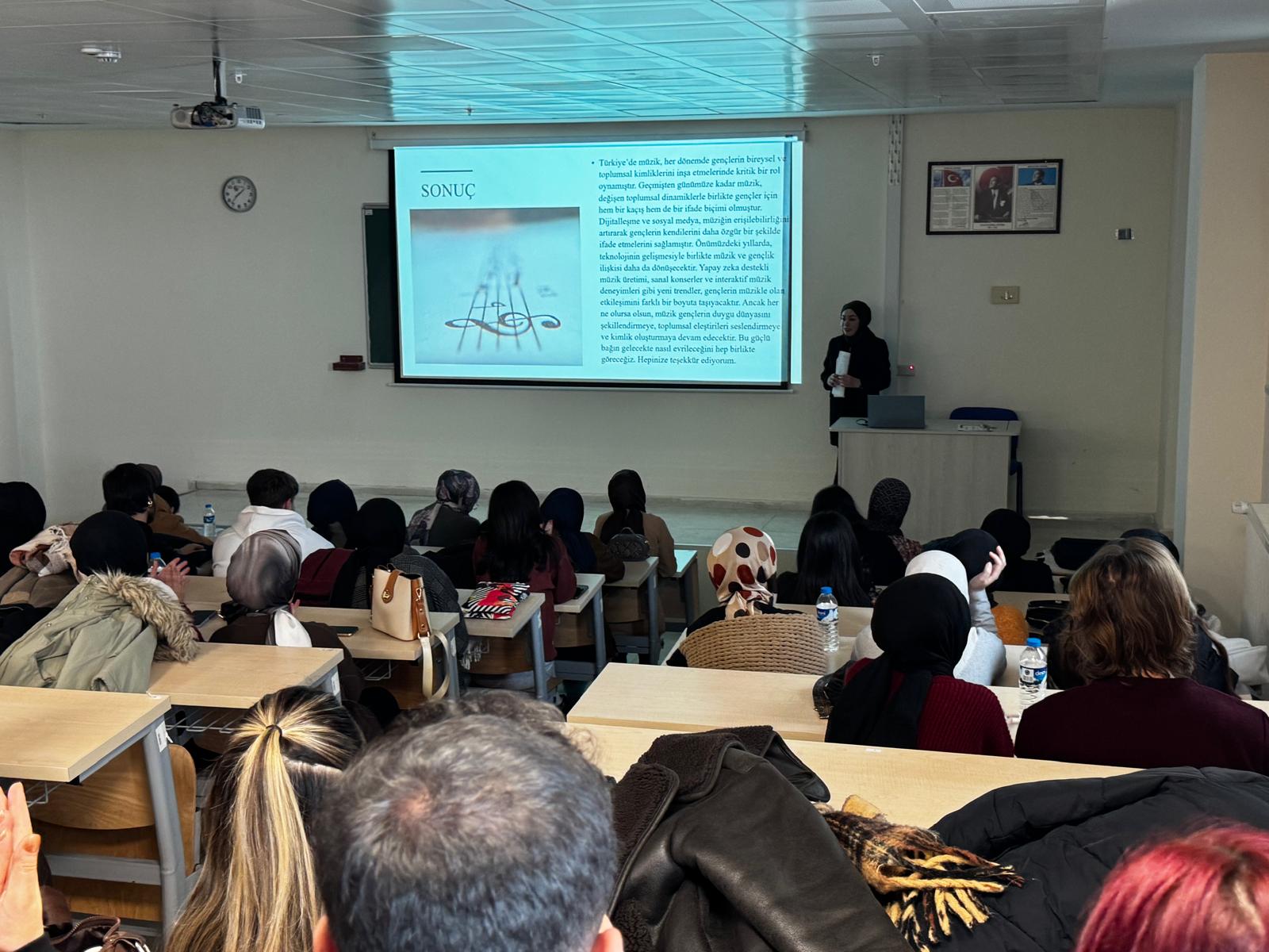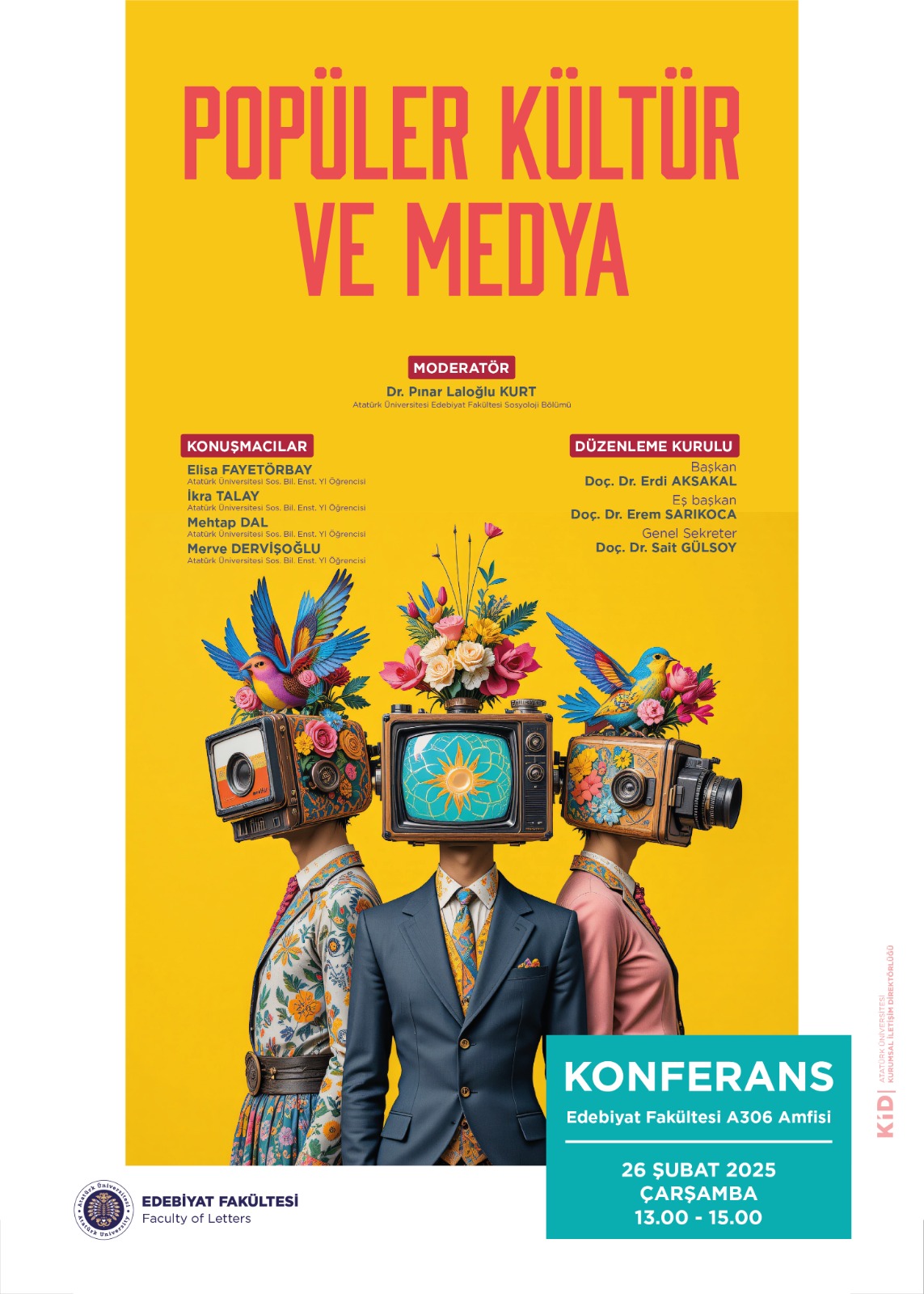 Bölümümüz tarafından “Popüler Kültür ve Medya” konferansı düzenlendi. Dr. Pınar Laloğlu’nun moderatörlüğünde gerçekleşen etkinlikte, yüksek lisans öğrencileri Elisa Fayetörbay, İkra Talay, Mehtap Dal ve Merve Dervişoğlu konuşmacı olarak yer aldı.