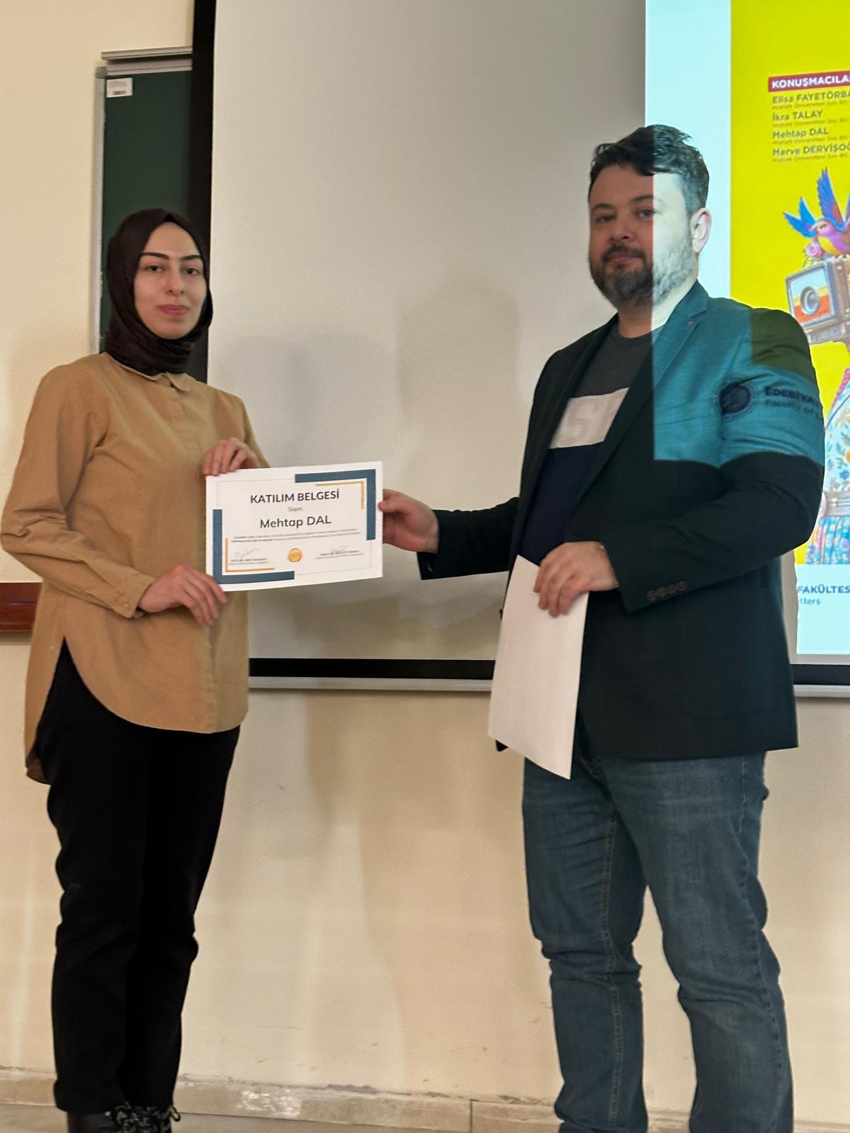 Etkinlik sonunda Bölüm Başkan Yardımcımız Dr. Öğr. Üyesi İsmail Öz, konuşmacılara katılım belgelerini takdim etti. Konferansa katkı sağlayan tüm konuşmacılara ve katılımcılara teşekkür ederiz.