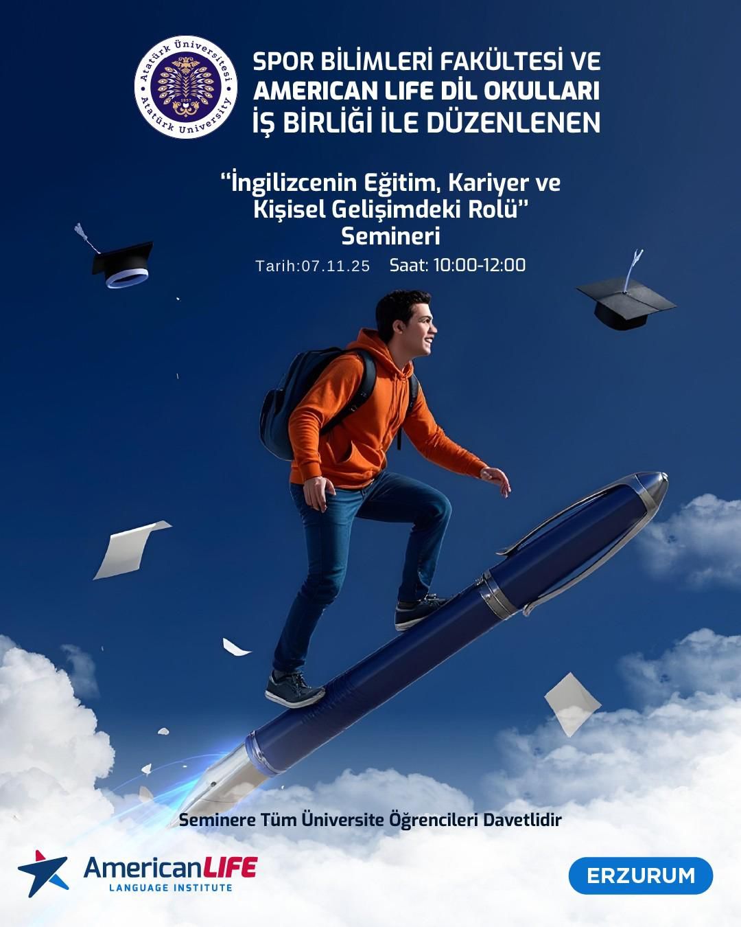 Atatürk Üniversitesi Spor Bilimleri Fakültesi ile American Life Dil Okulları iş birliğinde düzenlenecek olan “İngilizcenin Eğitim, Kariyer ve Kişisel Gelişimdeki Rolü” başlıklı seminer, üniversitemiz öğrencilerinin gelişimine katkı sunmak amacıyla gerçekleştirilecektir.