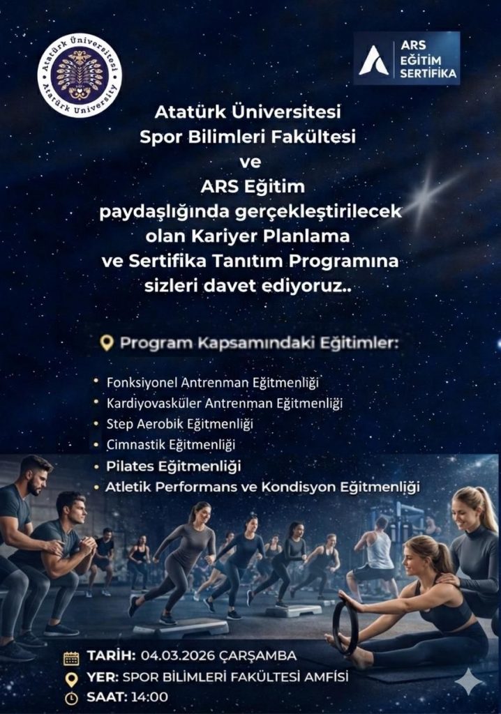 Atatürk Üniversitesi Spor Bilimleri Fakültesi ile ARS Eğitim Sertifika Programları iş birliğinde gerçekleştirilecek olan, öğrencilerimizin mesleki gelişim ve kariyer planlamalarına yönelik Eğitim Semineri Programı’na tüm öğrencilerimiz davetlidir.