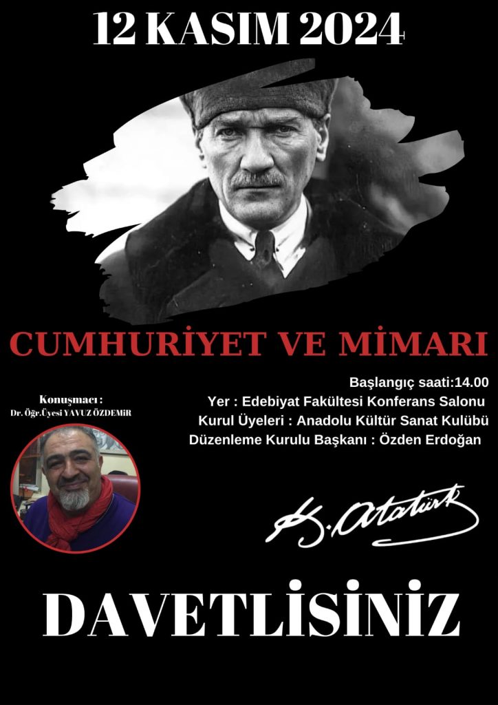 12 Kasım 2024 Salı günü, Edebiyat Fakültesi Konferans Salonu’nda Tarih Bölümü Anadolu Kültür-Sanat Öğrenci Kulübü tarafından “Cumhuriyet ve Mimarı” başlıklı bir konferans düzenlenecektir.