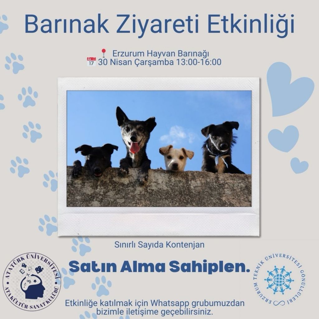 28 Nisan 2025 Barınak Ziyareti 🐾 Barınak Ziyareti – 30 Nisan Çarşamba 🐾Tarih Bölümü, Ata Kültür-Sanat Kulübü olarak sahipsiz dostlarımız için barınaktayız! 💚📍 Buluşma: Edebiyat Fakültesi ön kapı⏰ Saat: 13.00👟 Rahat kıyafet ve kapalı ayakkabı önerilir.🎁 İsteyenler mama, battaniye, oyuncak getirebilir.✨ Etkinliğimiz sınırlı sayıda kontenjanla yapılacaktır.📲 Kayıt için WhatsApp grubumuzdan bize ulaşabilirsiniz.Birlikte iyiliği büyütelim! 💕