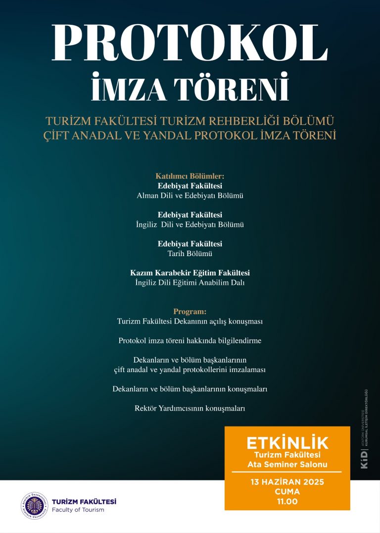 Atatürk Üniversitesi Turizm Fakültesi bünyesinde yer alan Turizm Rehberliği Bölümü ile Edebiyat Fakültesi ve Kazım Karabekir Eğitim Fakültesi bünyesindeki ilgili bölümler arasında Çift Anadal ve Yandal Protokol İmza Töreni düzenlenecektir.