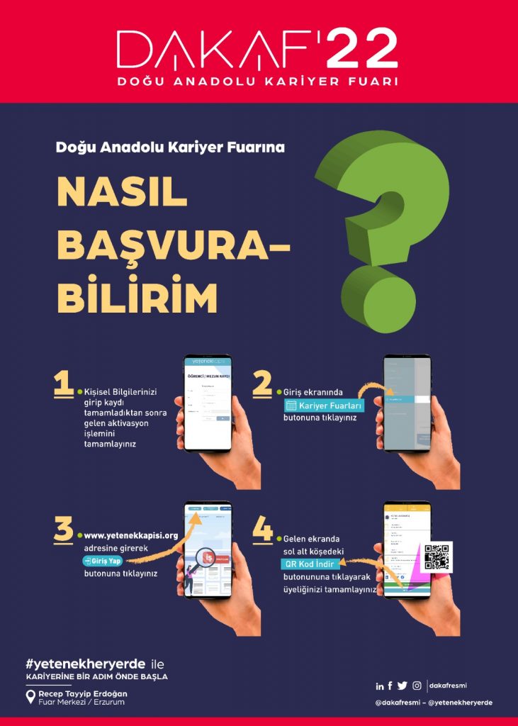 Doğu Anadolu Kariyer Fuarı (DAKAF’22) 7-8 Mart 2022 tarihlerinde bölgemizde yer alan 10 üniversitenin işbirliği ile üniversitemiz ev sahipliğinde Erzurum’da Recep Tayyip Erdoğan Fuar Merkezinde düzenlenecektir.