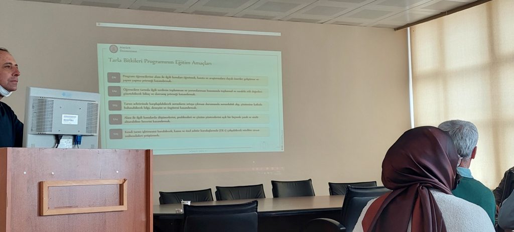 Tarla Bitkileri Programı’nın eğitim amaçlarını ve çıktılarını belirlemek üzere 25 Mart 2022 tarihinde iç ve dış paydaşların katılımıyla bir toplantı düzenlenmiştir. Toplantıya iç paydaş olarak bölümümüz akademik ve idari personelleri ile aktif öğrenciler; dış paydaş olarak Erzurum Ziraat Mühendisleri Odası Başkanı, Erzurum İl Tarım ve Orman Müdürlüğü Temsilcisi, Doğu Anadolu Tarımsal Araştırma Enstitüsü Temsilcisi, Tarım ve Kırsal Kalkınmayı Destekleme Kurumu Temsilcisi, Toprak Mahsulleri Ofisi Temsilcisi ve mezun öğrencilerimiz katılmışlardır. Toplantıya katılan paydaşların görüşleri doğrultusunda Tarla Bitkileri Programı’nın eğitim amaçları ve çıktıları belirlenmiştir. Ayrıca Ziraat Mühendisleri Odası Başkanı ve kurum temsilcileri öğrencilere çeşitli konularda bilgiler aktarmışlar ve öğrencilerimizden gelen soruları yanıtlamışlardır. Katılımlarından ve katkılarından dolayı tüm katılımcılarımıza Tarla Bitkileri Bölümü adına teşekkür ederiz.