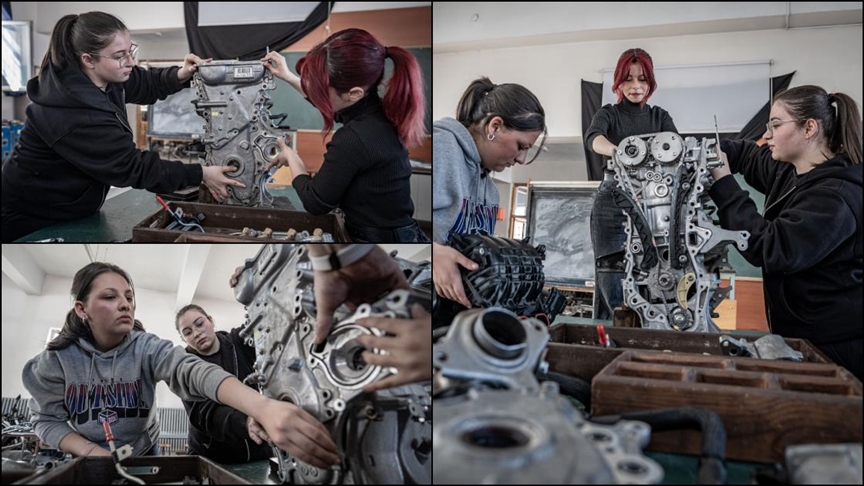 Okulun otomotiv teknolojisi programına bu eğitim öğretim yılı öncesinde kayıt yaptıran kızlar, teorik ve uygulamalı eğitimlere özveriyle katılıyor.