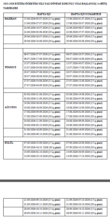 2025-2026 EĞİTİM-ÖĞRETİM YILI YAZ DÖNEMİ ZORUNLU STAJ BAŞLANGIÇ ve BİTİŞ TARİHLERİ