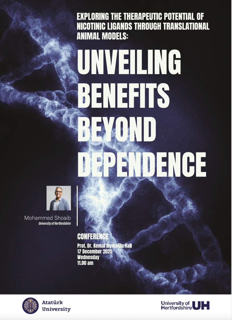 Atatürk Üniversitesi Tıp Fakültesi, University of Hertfordshire’dan Prof. Dr. Mohammed Shoaib’i ağırlayacak. “Exploring the Therapeutic Potential of Nicotinic Ligands Through Translational Animal Models: Unveiling Benefits Beyond Dependence” (Translasyonel Hayvan Modelleri Aracılığıyla Nikotinik Ligandların Terapötik Potansiyelini Keşfetmek: Bağımlılığın Ötesindeki Faydaları Ortaya Çıkarmak) başlıklı konferans, nikotinik reseptör sistemlerinin bağımlılık yapıcı özelliklerin ötesindeki terapötik uygulamalarına ışık tutacak.